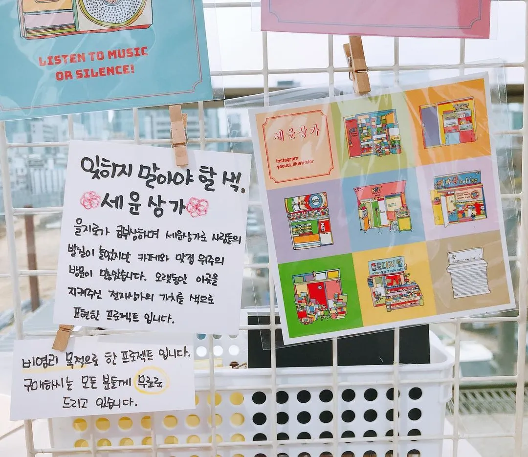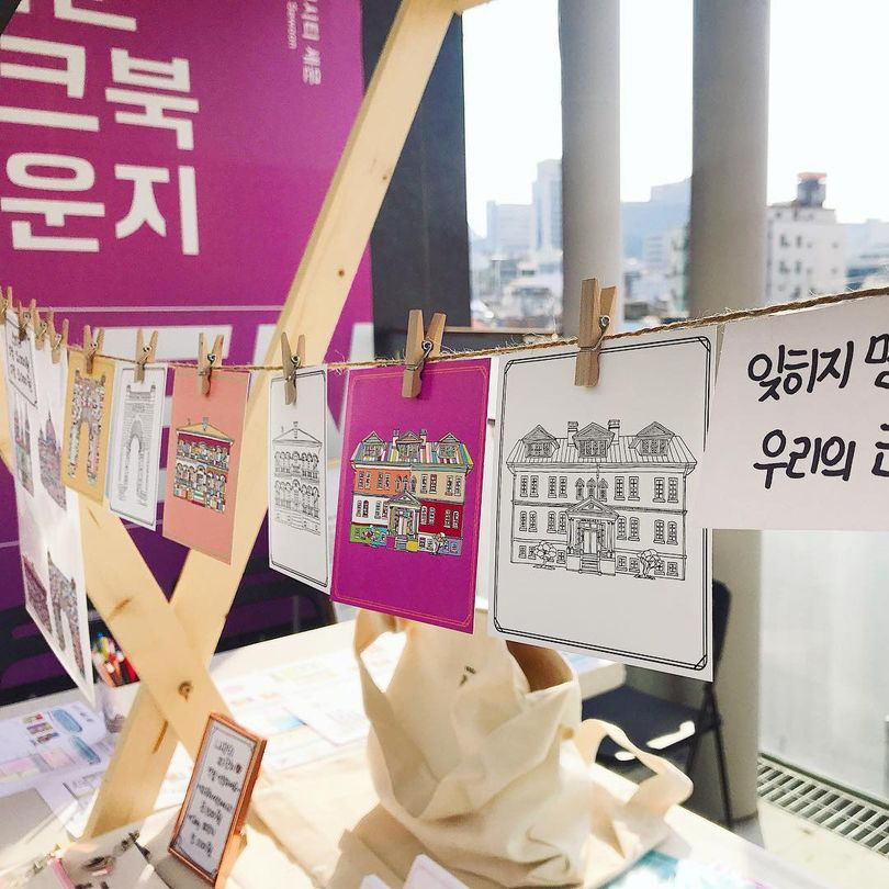 플리마켓에서 반응이 좋았던 작품은 <잊히지 않아야 할 색, 우리의 근현대사>와 <What a stweet life> 일러스트였다. 근현대사 일러스트는 우리의 가까운 역사에서 중요한 장소이지만 중고등학교 때 배우고 어른이 되면서 점점 잊게 된 근현대 건축물을 일러스트로 표현하였다. 나는 플리마켓을 할 때 테이블 한쪽에 일러스트를 뒤집으면 건축물 이름을 알 수 있게 진열해놓고 사람들이 직접 참여할 수 있게 하였다. 독립문 일러스트는 글씨가 쓰여 있기도 하고 너무 명백하게 다 아는 건축물이기에 모두 쉽게 맞췄지만, 나머지는 아리송해하였다. 일러스트를 뒤집었을 때 이름을 확인한 사람들의 반응은 다양했다.