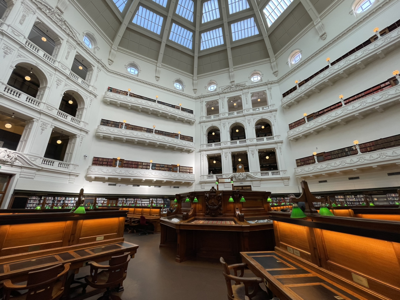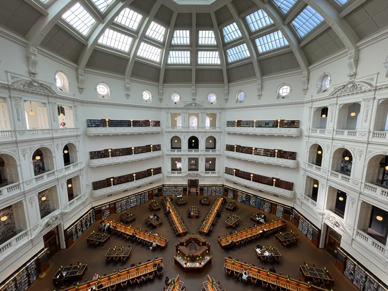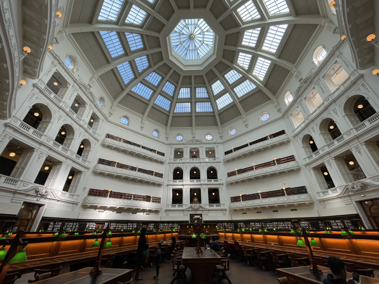 빅토리아 주립 도서관은 멜버른에서 굉장히 상징적인 곳이기도 하다. 가장 활발한 시티의 중심에 있으며 건축물이 고풍스럽고 아름답다. 내부에는 마치 해리포터의 호그와트 학교를 연상케 하는 공간도 있다. 언뜻 봐도 역사가 꽤 되어 보이는 곳이다. (아래 사진 참고) 이 아름다운 다각형 구조의 돔 공간은 관광객에게도 필수 코스 중 하나이다. 도서관이 시티에 위치해 접근성도 편할뿐더러 갤러리도 있고 독특한 돔 구도의 도서관 내부를 한눈에 내려다 볼 수 있는 공간도 잘 마련되어 있다.