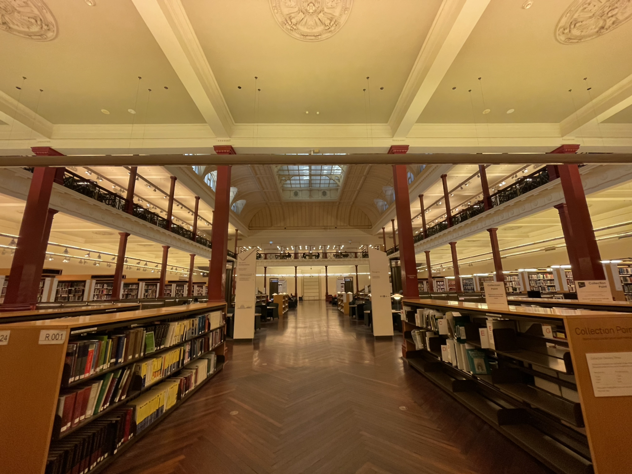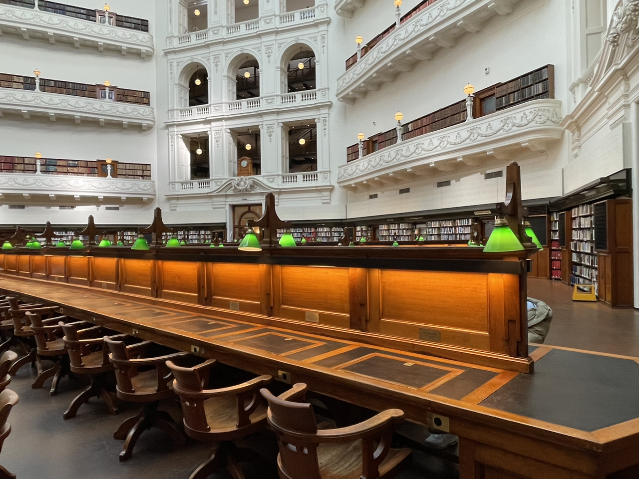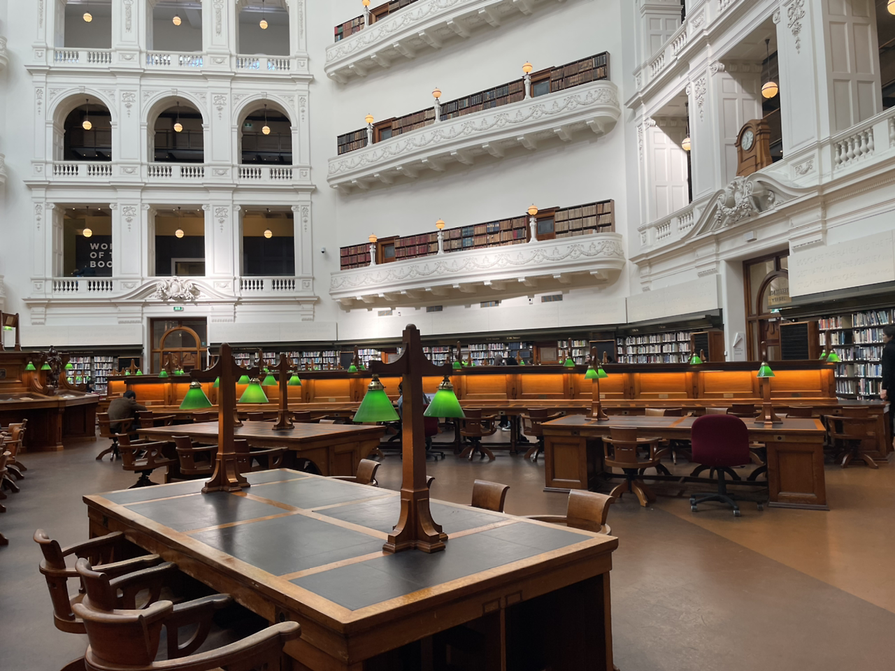 빅토리아 주립 도서관은 멜버른에서 굉장히 상징적인 곳이기도 하다. 가장 활발한 시티의 중심에 있으며 건축물이 고풍스럽고 아름답다. 내부에는 마치 해리포터의 호그와트 학교를 연상케 하는 공간도 있다. 언뜻 봐도 역사가 꽤 되어 보이는 곳이다. (아래 사진 참고) 이 아름다운 다각형 구조의 돔 공간은 관광객에게도 필수 코스 중 하나이다. 도서관이 시티에 위치해 접근성도 편할뿐더러 갤러리도 있고 독특한 돔 구도의 도서관 내부를 한눈에 내려다 볼 수 있는 공간도 잘 마련되어 있다.