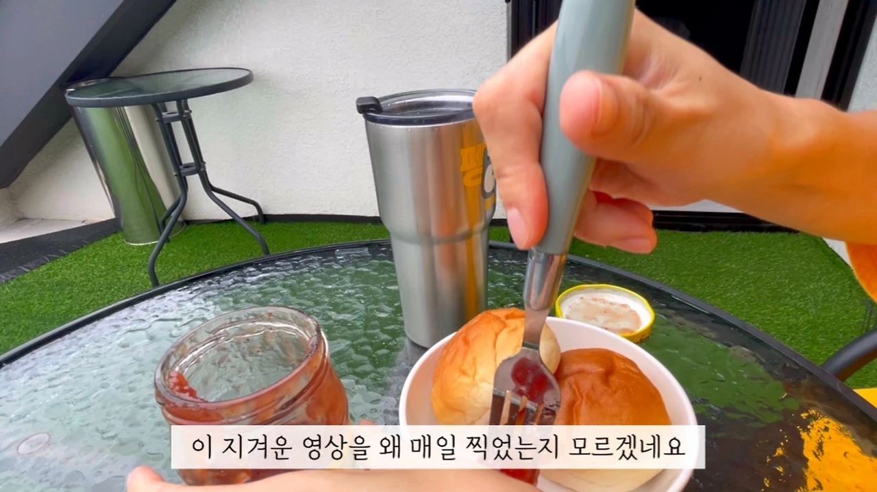 그때 당시 무슨 야심 찬 생각이었는지 통영에서 보내는 하루하루를 브이로그로 만들어 보기로 결심했다. 아침에 일어나자마자 내가 하는 일은 창문을 열면서 핸드폰으로 영상을 찍는 것이었다. 그리고 매일 똑같이 먹는 빵과 커피를 촬영했다. 이 지겨운 영상을 왜 매일 찍었는지 모르겠다. 편집하는 나조차도 지겨웠다. 매일 아침 같은 장소 같은 아침. 알면서도 똑같은 영상을 브이로그에 담는다. 혹시나 통영살이 브이로그를 처음 보는 사람을 위해.