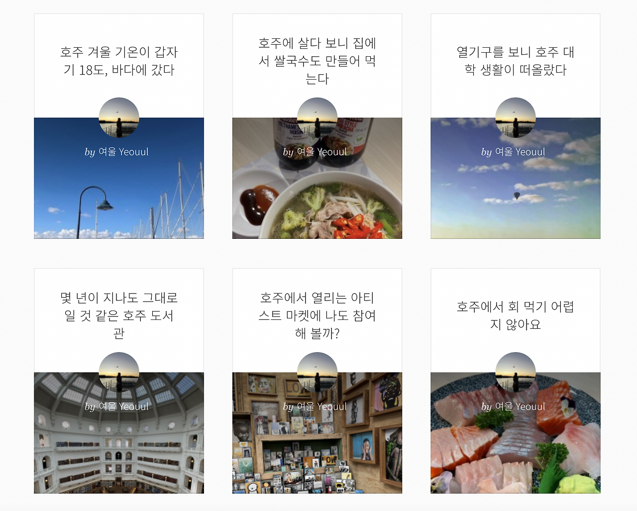 혼자 기록용으로 쓴 글인데 많은 사람이 읽는다고 생각하니 살짝 부끄럽기도 하고 내심 뿌듯하기도 하였다. 이때부터였다. 나의 호주살이 이야기를 꾸준히 업로드하였다. 그 결과 5개월 동안 올린 11개의 호주살이 포스팅 중에서 8개의 글이 다음과 브런치 메인에 노출되었다. 사실 메인 노출을 바라고 쓴 글은 아니었지만, 감사히도 메인에 올라와 많은 사람이 내 글을 접하였다.