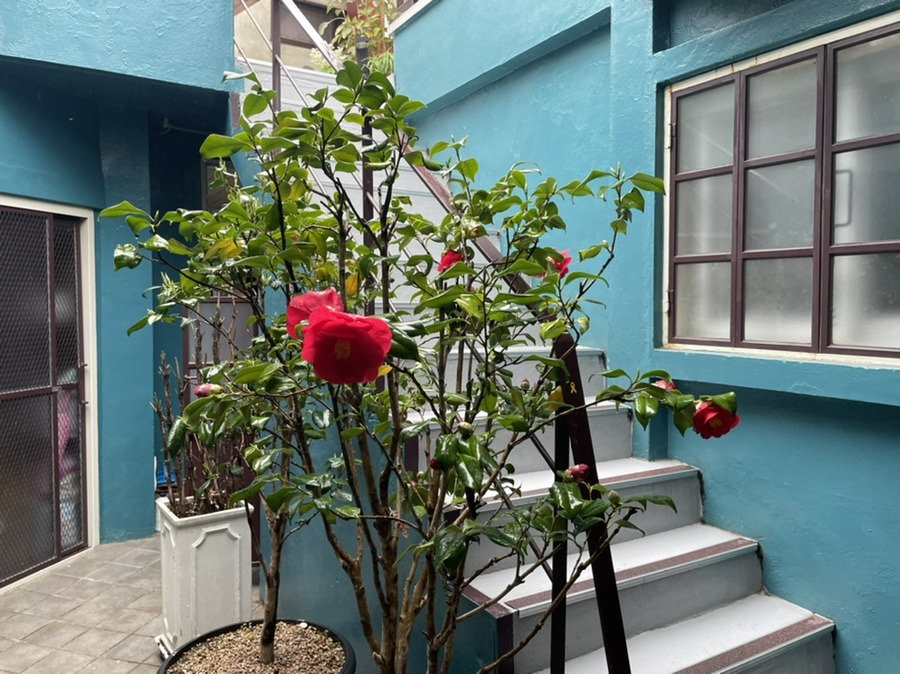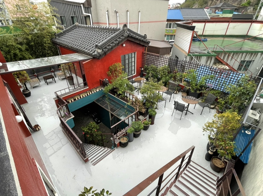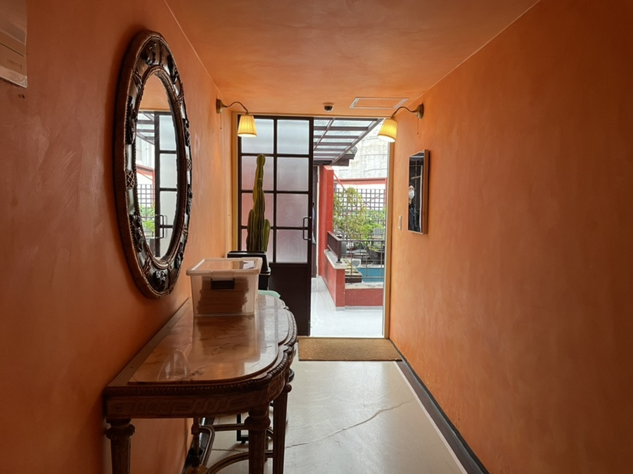 식사를 마친 후 우리는 숙소로 향했다. 오빠가 독특하고 이색적인 숙소를 예약해 놨다. 오빠 대신 엄마와 내가 왔다. 입구에 들어서자마자 에메랄드색 벽과 대비되는 빨간색 꽃이 한눈에 들어왔다. 전체적으로 숙소의 인테리어 색감과 소품이 하나하나 다 인상적이었다.