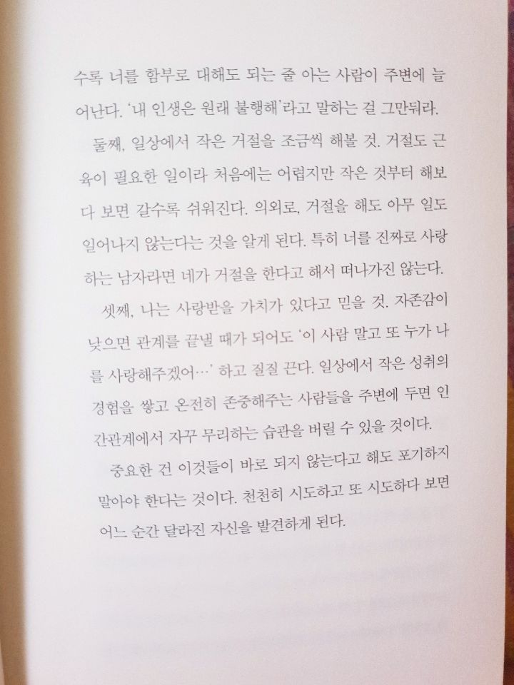 바닥까지 직면한 후에야 난 나 스스로가 너무 가여워졌다. 이불 밖을 나올 수 없을 정도로 한 동안 호되게 앓았다. 오랜 시간이 흐른 후 나는 나를 사랑하는 습관을 가지려고 노력했다. 내가 가진 매력과 장점을 하나하나 찾아 글로 기록했다. 조금씩 나의 의사도 표현해보았다. 오히려 그럴수록 사람들은 나를 더 좋게 보았다. 바보같이 네네, 거리지 않으니 쉽게 보지도 않았다. 기분 나쁜 티를 내더라도 사람들은 나를 싫어하지 않았다. 그럴수록 나는 점차 내 의사표현을 하는 것이 쉬워졌고, 조금씩 당당해졌다. 그리고 나 스스로도 내가 예전만큼이나 못나 보이지도 않았다. 그제야 난 내 마음의 소리에 제대로 귀를 기울이기 시작했다.