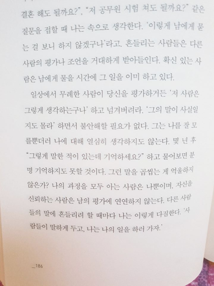 마지막, 가장 중요한 것 나를 지키는 법. 이 책에서 가장 중요하게 서술하고 있는 것이 아닌가 싶다. 타인의 평가에도 좌지우지 않고 견고하게 내 주관을 지키는 것 …. 날카로운 비판에도 쉽사리 생채기가 나지 않도록 마음이 단단해지는 법, 그 모든 것은 나 스스로에 대한 확신에 비롯된다고 말하고 있다. 타인이 나에게 무엇이라고 하던지 좋은 얘기면 잘 새겨들어 나의 좋은 점이 되게 하고, 무작정 하는 힐난이라면 한 귀로 듣고 한 귀로 흘리자.