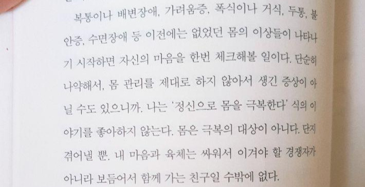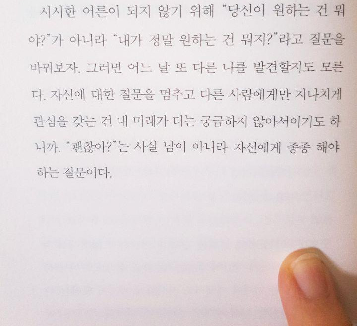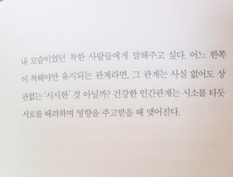 하지만 그럴 때마다 뒤돌아서면 마음이 찜찜하고 어딘가 불편했다. 이제와 생각해보니 내 마음도 말을 하고 있었던 것이다. 아니면 아니다, 맞으면 맞다, 힘들면 힘들다. 여러 번 외치고 있었으나 타인의 시선이 더 무서웠던 나는 내 마음의 소리에 귀 기울이지 않았다. 그 얼마나 바보 같은 짓인가. …