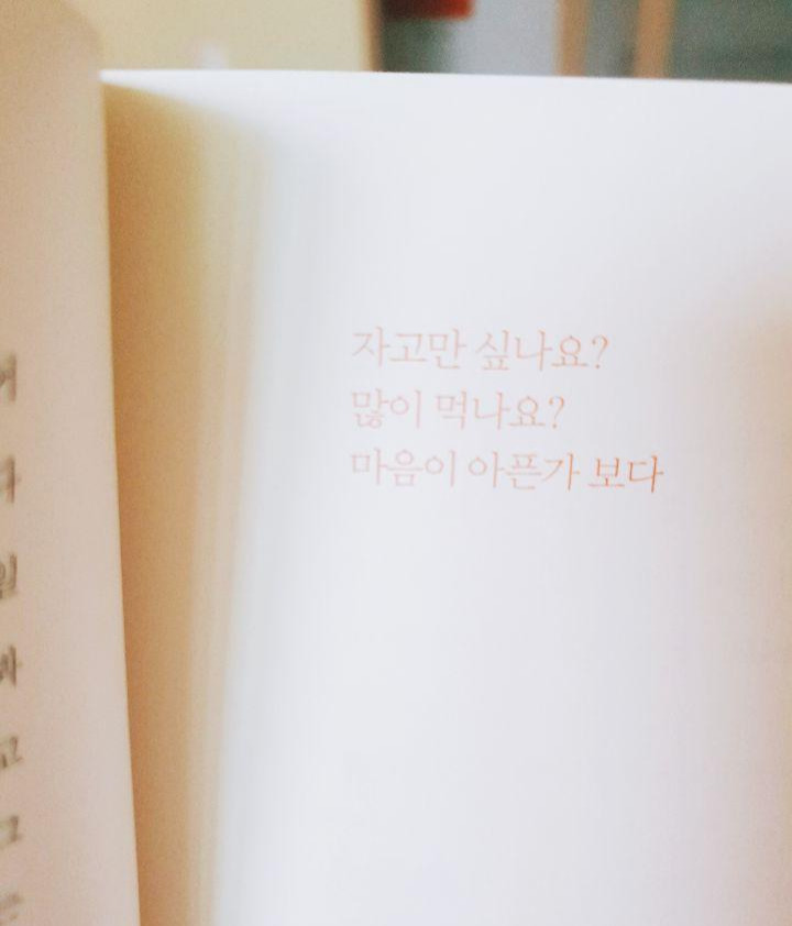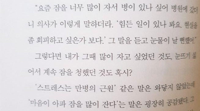 지금 생각해보면 그때 나는 이 책이 서술한 것처럼 마음이 아파서 그랬던 것 같다. 누군가의 죽음에 무뎌진 게 아니라 그 죽음을 통해 아팠던 예전의 시간들이 생각나 나는 현실에서 도망치고 싶었던 것 같다. 또한 다른 직장에선 연차가 쌓이면 일이 편해진다고 하는데 이 세계에선 오히려 쌓이는 연차만큼이나 일이 많아졌다. 늘 중압감과 책임감이 항상 나를 짓눌렀고, 나는 항상 어깨에 짐을 한가득 얹은 듯 축 쳐져서 출근했었다. 여러 가지의 스트레스는 나를 항상 옥죄었고 이제와 생각해보니 나는 모든 것에서 벗어나고 싶어 현실도피 차원으로 수면의 세계로 떠났던 것 같다.