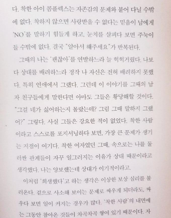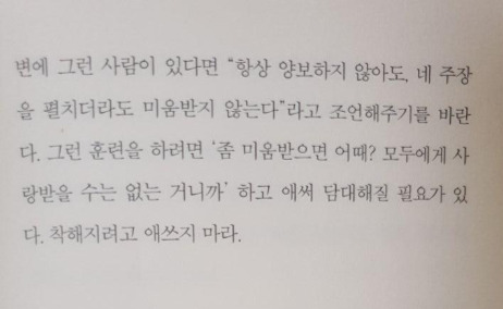 저자는 첫 시작부터 우리에게 착한 사람이 될 필요가 없다고 서술하고 있다. 항상 양보하지 않아도 주장을 펼치더라도 미움을 받지 않는다고 얘기를 한다.