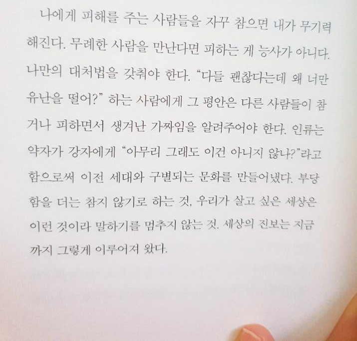 앞으로도 이런 사람을 수없이 만날 거고, 여러 부딪히는 상황들이 올 것이다. 그때마다 이 책이 내게 알려준 조언들을 하나하나 가슴에 새기며 실천해야겠다. 부당함을 참지 않고 무례한 것에 당당히 맞서 싸울 수 있는 용기가 더해지는 내가 되고 싶다.