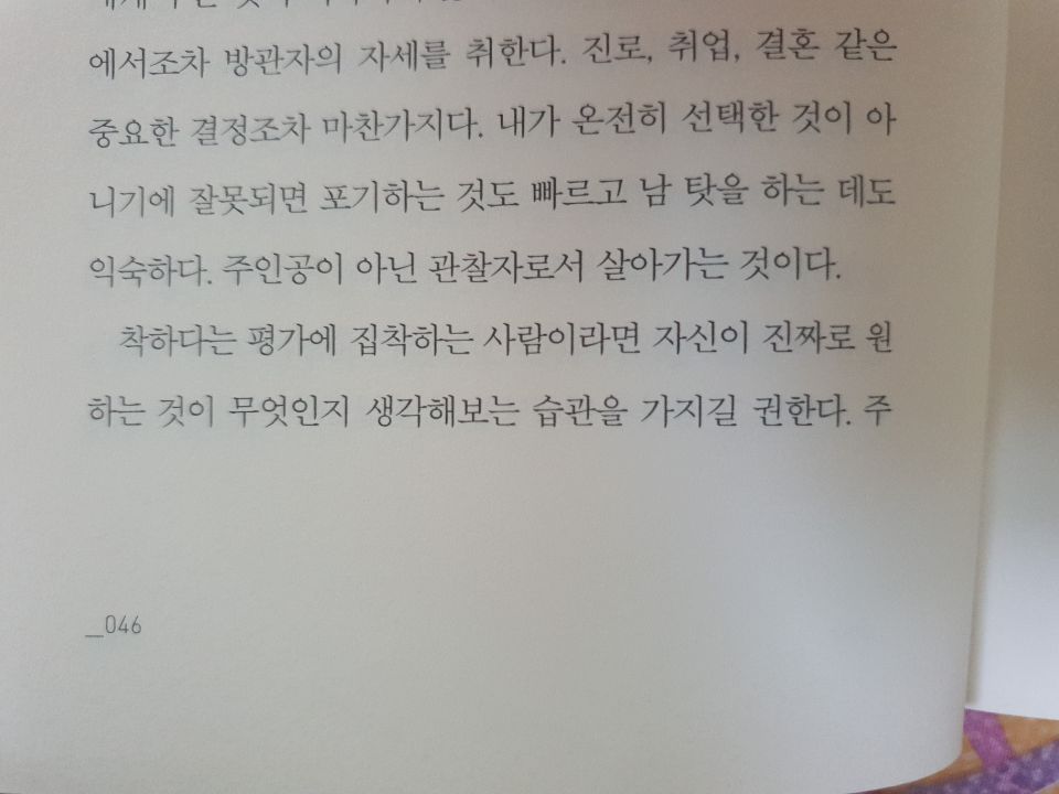 그런 일이 하나둘씩 늘어가며 나는 자신감을 잃고 위축되었고 "착하다."란 말은 그 당시 내가 들을 수 있는 유일한 칭찬이었기에 나는 그 말을 듣기 위해 내가 할 수 있는 최선을 다해 더 착해지려고 노력했다. 그럴수록 남들 기준에 맞춰 살려고 하고 남들이 하는 얘기에 줏대 없이 흔들렸다. 서서히 나는 주제성을 잃어갔고 내 의견을 내는 것이 어려워졌다. 그렇게 어른이 되어버린 나는 인생의 중대한 결정을 해야 하는 순간에도 내 판단을 내리기가 버거워지는 지경에 이르렀다.