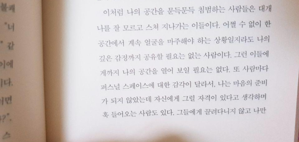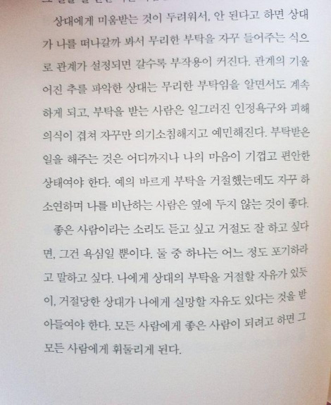 나의 모습을 돌이켜보면, 난 항상 타인이 나를 미워할까 봐 반대 입장을 내는 것이 어려웠다. 내 마음속에서는 '그건 아닌데' 싶은 것들도 입 밖으로 내면 질타를 받을까 싶어 꾹 삼키고 다수가 따르는 의견으로 목소리를 낸 적이 여러 번 있었다. 거절도 마찬가지였다. 거절하면, 상대가 나를 싫어하지 않을까? 그게 무서워 나는 항상 타인의 부탁을 들어주기 바빴다.