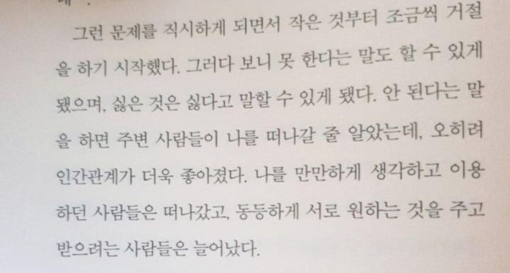 하지만 커가면서 나는 여러 한계들에 부딪혔다. 남에게 착해 보이기 위해서 내가 할 수 있는 선을 넘어선 일에도 발 벗고 나서게 되었고, 정의감인지 책임감인지 모를 감정에 불타 굳이 내가 하지 않아도 되는 일까지 해내려고 애를 썼다. 그 순간 나에게 가장 필요한 의사표현 수단인 '거절'의 방법도 모른 채 나는 남의 일을 하다가 내 일까지 못하게 되는 불상사를 여러 번 겪었다. 그러던 어느 날 고개를 돌리니 똑 부러지게 자기 의사표현을 하는 친구가 눈에 들어왔다. 누군가의 부탁에도 자신이 할 수 있는 선이 아닐 때는 명확하게 선을 그으며 자기 의견을 피력하는 친구가 너무 빛나 보였다. 무엇보다 내가 가장 크게 놀랐던 건, 그 친구가 단호하게 거절하더라도 다른 이들은 그녀를 미워하지 않는다는 것이었다.