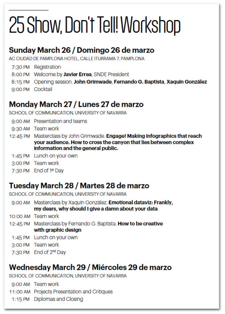 Show Don't Tell(SDT)는 Malofiej World Summit이 열리기 전 일요일부터 수요일까지 진행되는 워크숍이다. 20-25명 정원으로 다른 주제의 워크숍 3개가 열린다. 올해는 John Gridwade(Ohio University)가 creating compelling, well-formed concepts, and not on technical expertise란 주제로, Xaquin Veira Gonzalez(The Guardian)가 Data를 활용한 Interactive Storytelling 제작을, Fernando Baptista(National Geographic)가 내셔널지오그래픽에서 sculpture를 활용한 3D 모델링에 관한 주제로 맡아줬다. 난 그중에 Interactive Storytelling을 선택했는데 아무래도 디자인보단 데이터를 다루는데 익숙하기 때문이었는데 사실 가장 인기 있는 건 내셔널지오그래픽에서 인포그래픽을 제작하는 과정을 배워볼 수 있는 Fernando의 워크숍이다. 왼쪽에 보이는 일정처럼 3일 동안 정말 힘들게 진행됐다. 언어는 영어를 활용하며 참가비는 720유로임을 참고.