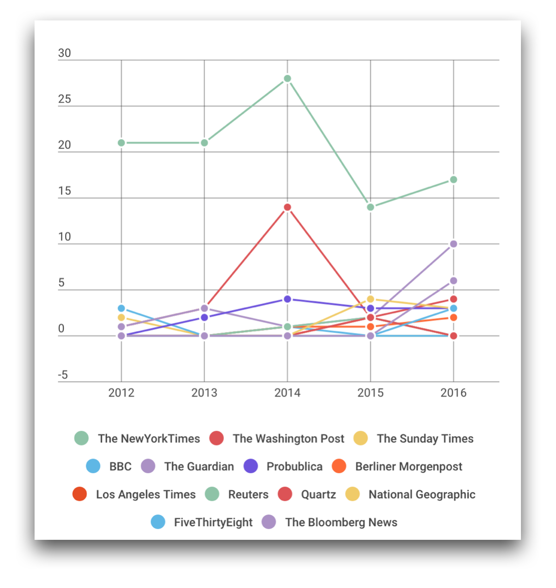 잠깐 다른 이야기를 해보면, 해외에선 2010년 이후 많은 미디어에서 폭발적으로 데이터 시각화를 활용하고 있으며 그 관심은 Malofiej 수상 현황을 봐도 알 수가 있다. 뉴욕타임스뿐만 아니라 다양한 언론에서 데이터 시각화를 다루기 시작하고 기사에 많은 차트를 활용하기 시작했지만 위의 저 부분이 고민이었다.