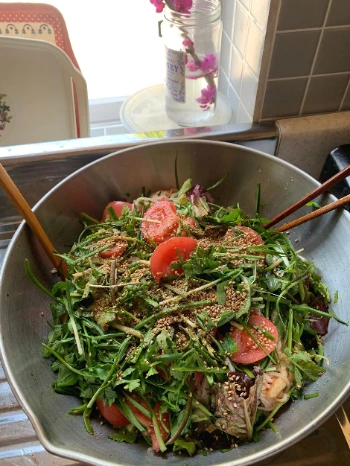 추억을 하나 더 꺼내자면 여름엔 토마토와 여름 야채가 무럭무럭 자라, 온 가족이 반기는 음식 중 하나인 비빔국수를 먹는다. 국수를 한입 가득 먹어야 맛있다는 숙모께선 국수를 정말 양껏 하신다. 토마토, 상추, 부추, 각종 채소, 거기에 양파를 얇게 슬라이스하고 고추장과 직접 담근 효소, 감식초로 양념장을 만든다. 마지막으로 고소한 깨를 빻아 화룡점정으로 올려주면, "여름 야채 비빔국수" 완성이다. 한참 바깥일 하고 들어와 먹는 이 국수의 맛은 정말 내 인생 국수다. 채소의 극도의 신선함과 고소함은 잊기 힘든 맛이다. 그 계절마다 그 계절의 향기를 풍기는 음식을 먹을 수 있다는 것은 정말이지 기쁨이다.