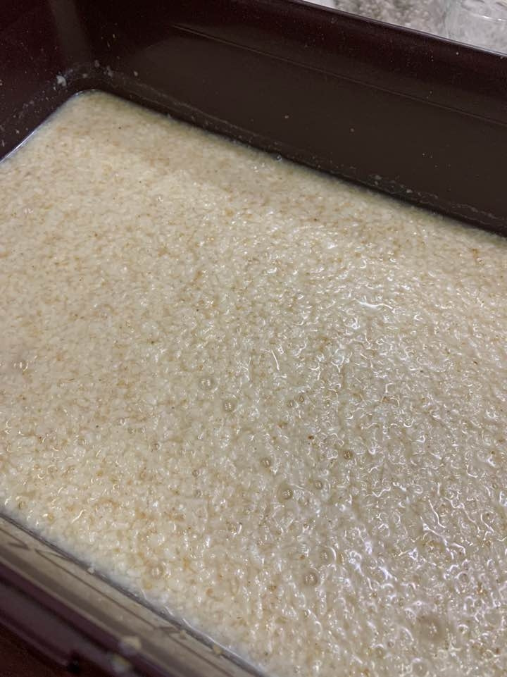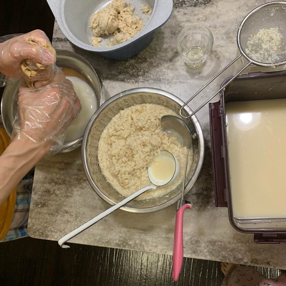 6. 치댄 누룩을 소독한 통에 넣고 생수 2L를 부어 자박자박 잠길 정도로 둔다. 면보를 씌워 서늘한 곳에 보관