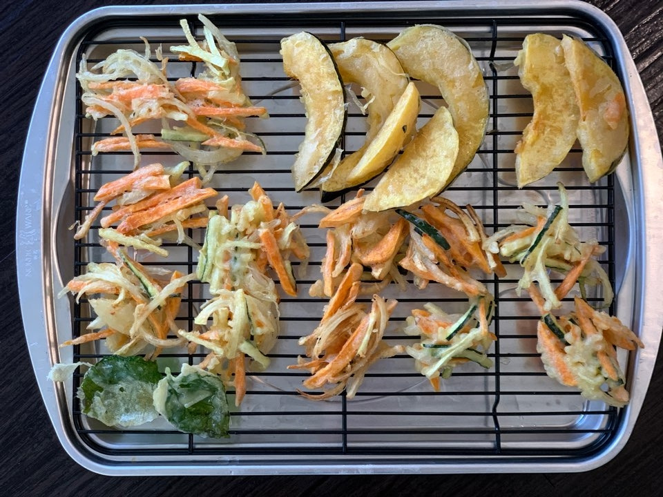 이렇게 채소 몇 가지로 야채튀김을 만들어 두면 여러 가지 음식들과 두루 응용이 가능하다. 말간 국물의 우동 위에 얹으면 고소하고 기름진 야채튀김우동이 되고, 매콤한 김치국수의 아린 맛을 중화하는 사이드 메뉴도 된다. 버섯, 아스파라거스, 단호박, 감자, 고구마 냉장고에 남아있는 어떤 채소든 썰어서 튀겨내면 근사한 맥주 안주가 된다. 채소라 고기를 튀기듯 오랜 시간이 걸리지도 않는다. 아삭이는 식감을 남기기 위해 살짝 데치는 느낌으로 튀겨주어도 좋겠다.
