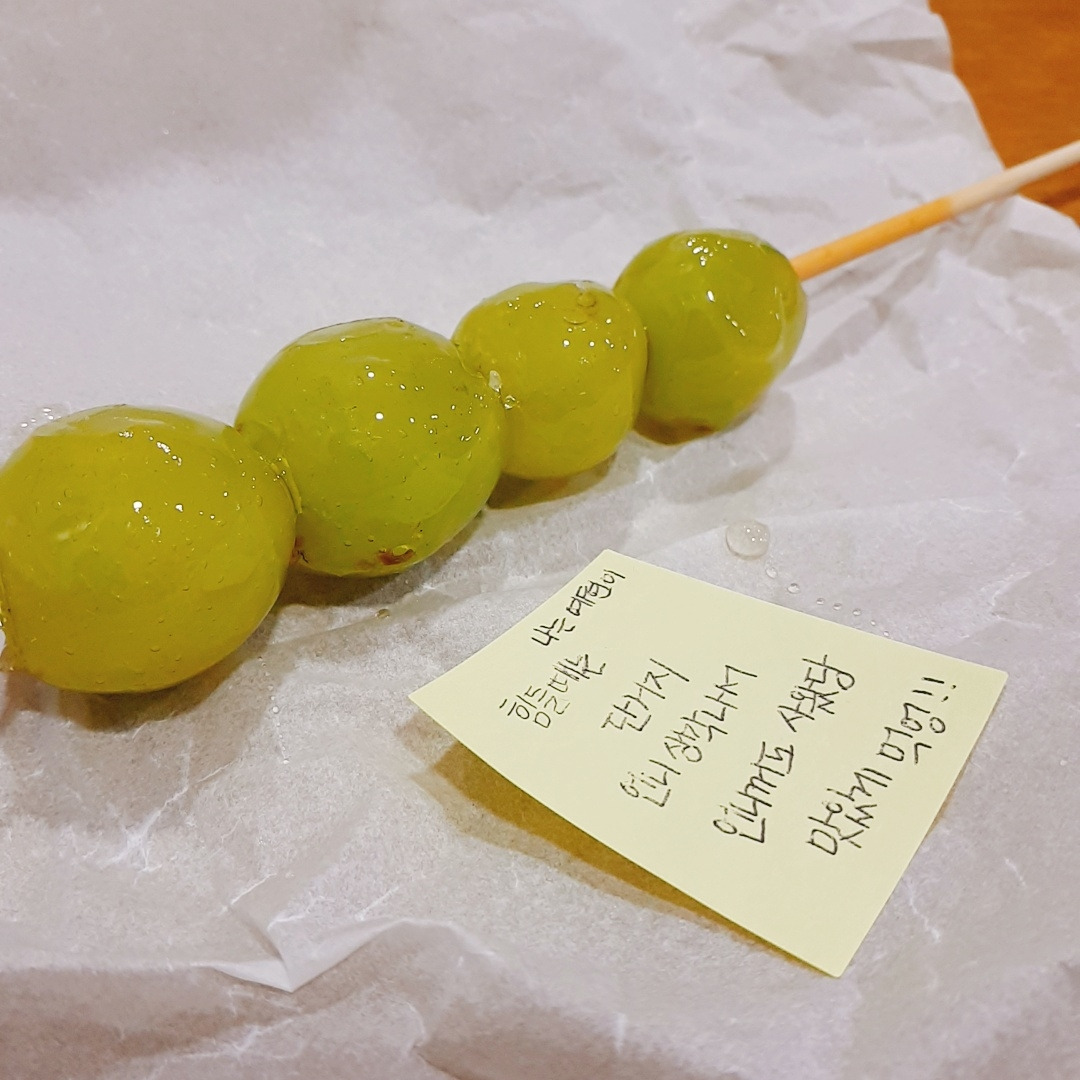 종이 안에는 반짝이는 연둣빛 청포도탕후루가 들어있었다.