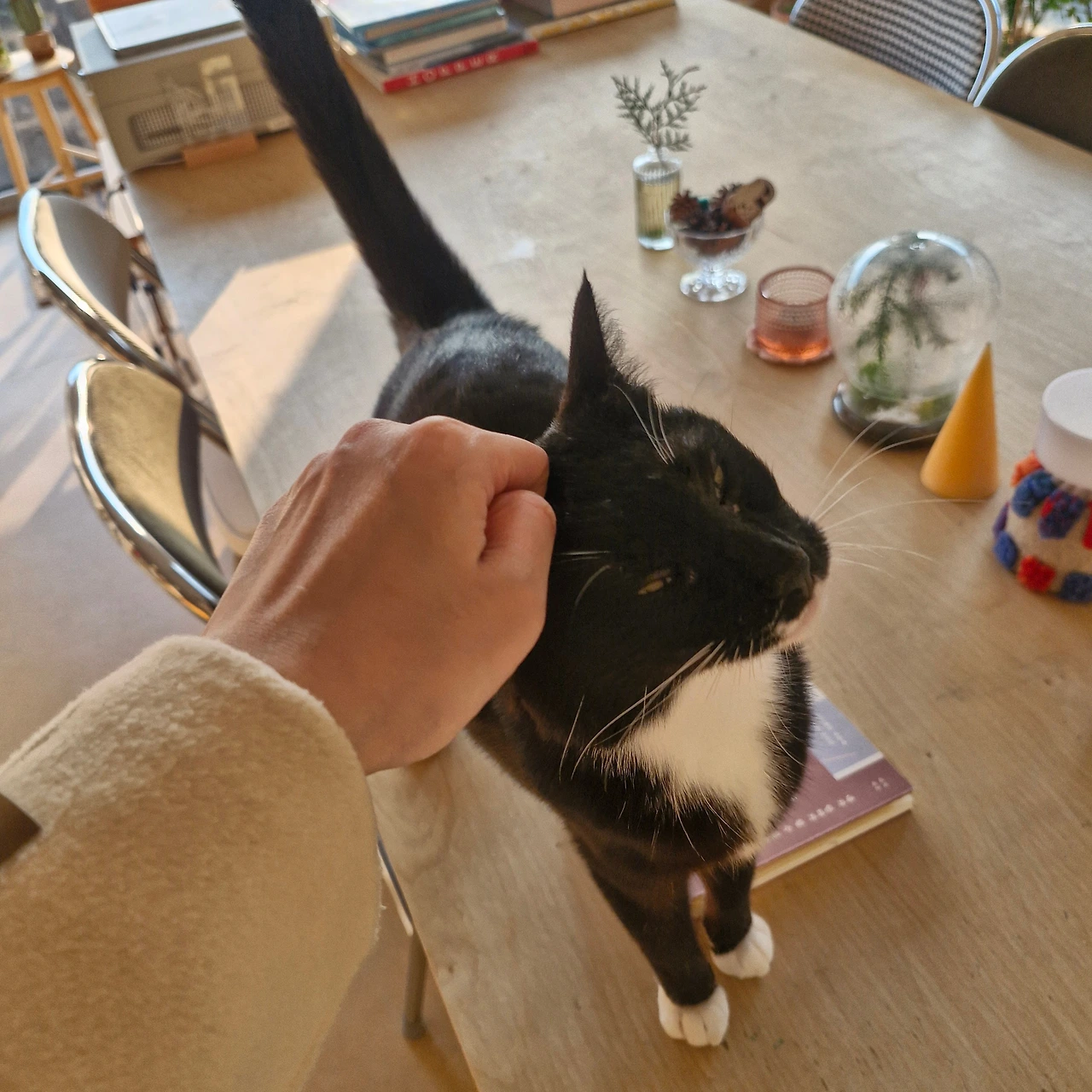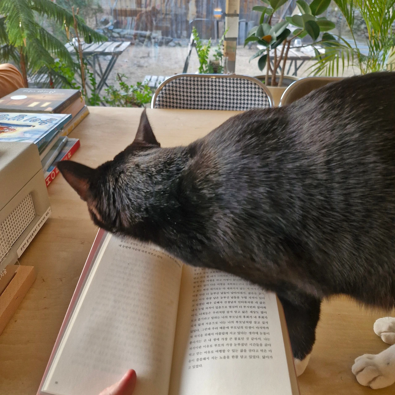 책을 고르던 내내 내 주변을 맴돌던 이곳의 터줏대감 고양이인 '머루'가 쏜살같이 책상 위로 뛰어올라 책에 마구 얼굴을 비비다가 책 틈의 내 손을 파고든다.