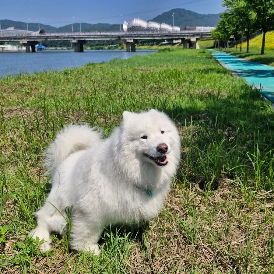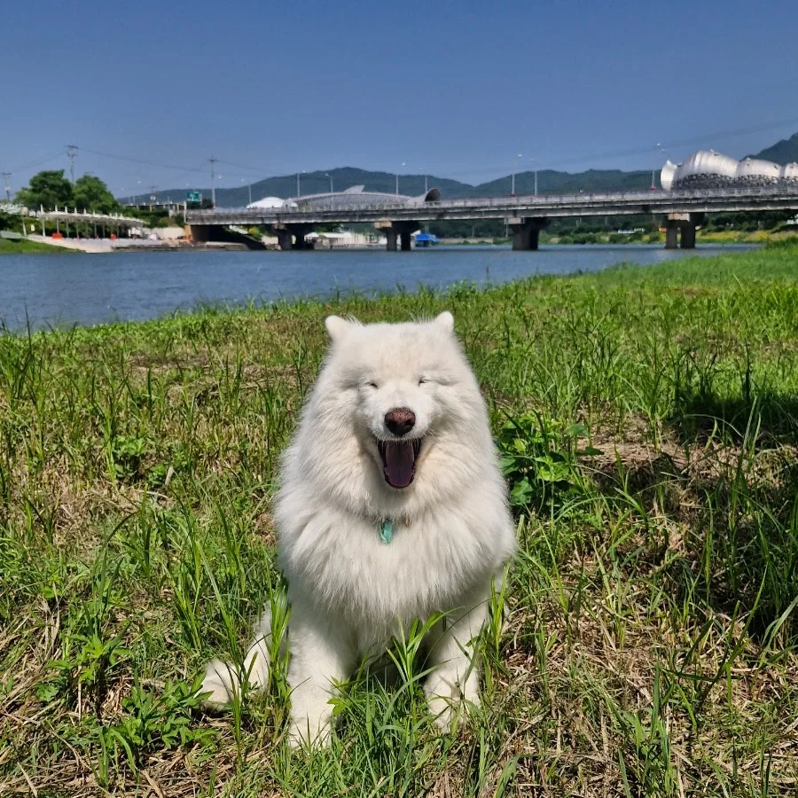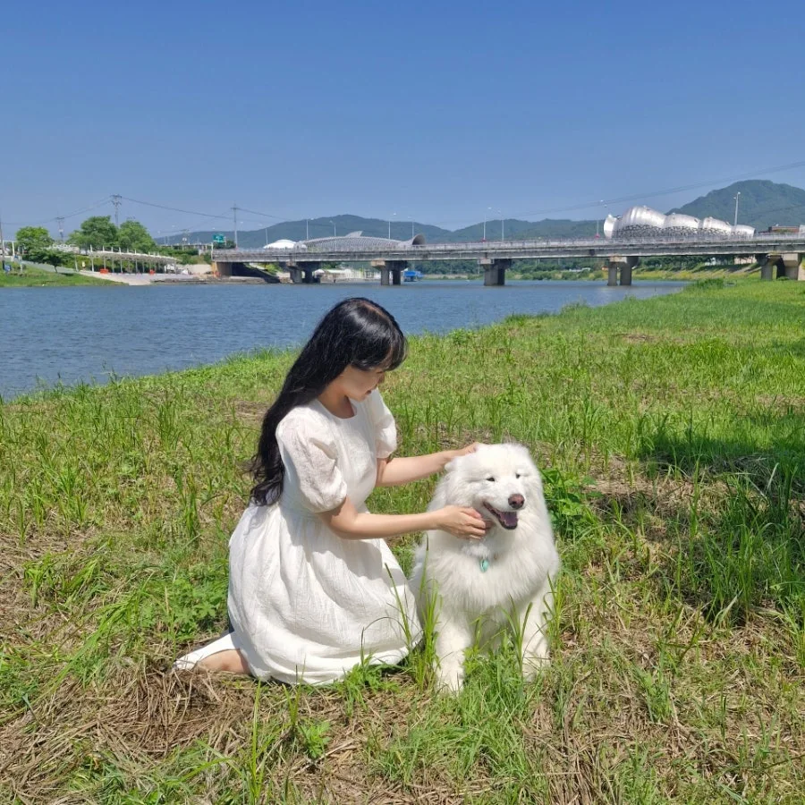 멀리서부터 잔뜩 들뜬 걸음으로 산책을 하며 걸어오던 하얀 강아지 한 마리가 신나게 뛰어 내 곁으로 다가왔다.
