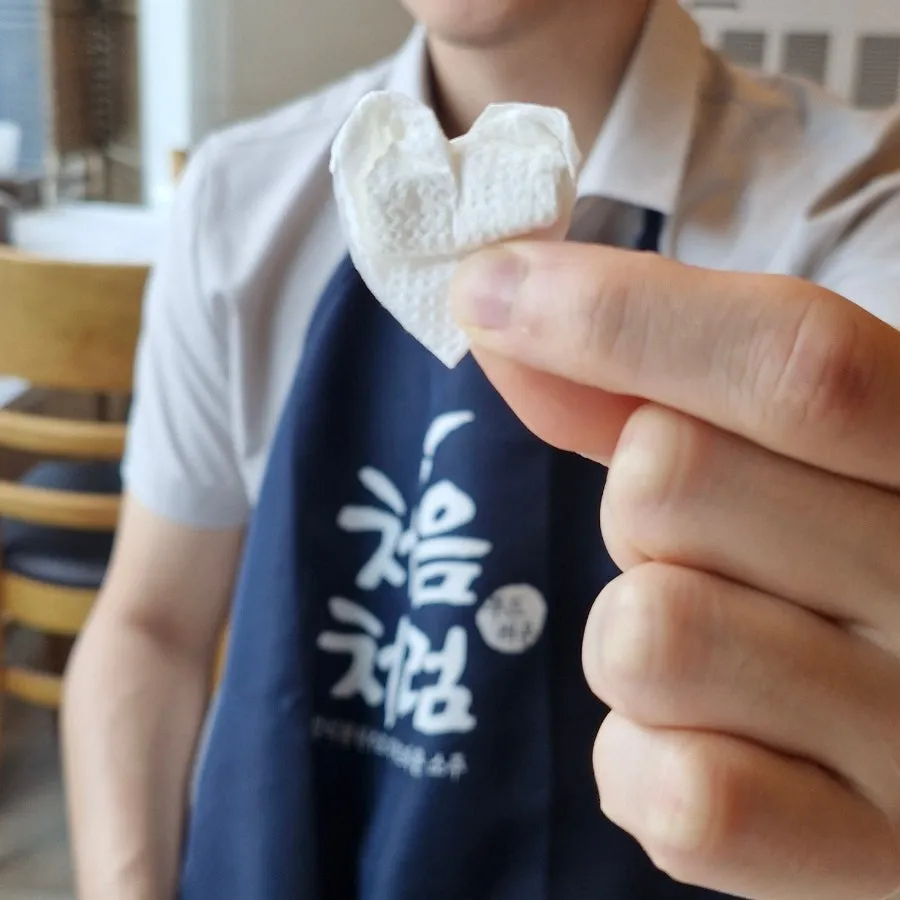 식당에서 뭘 꼼지락거리며 접길래 봤더니 냅킨으로 예쁜 하트를 만들어주던 남편.