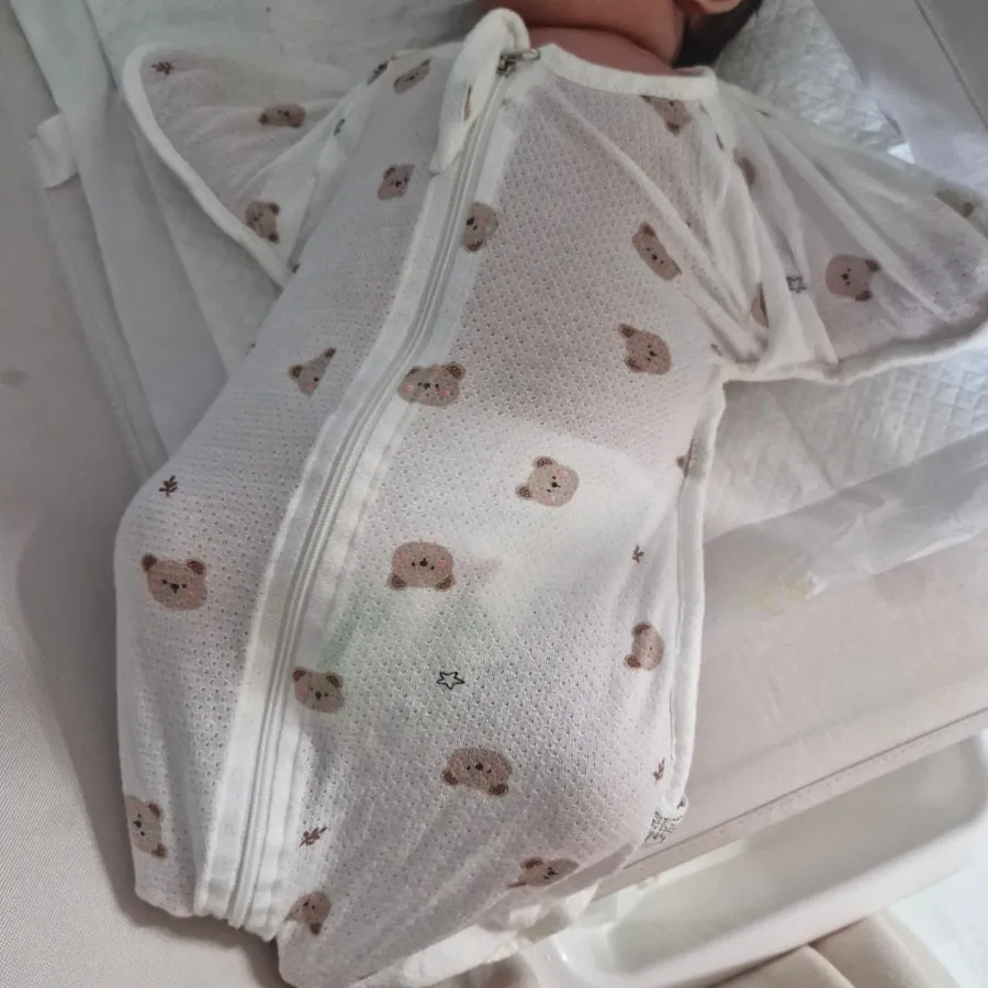 체온이 37.5도를 넘겼을 때부터 아기를 다 벗기고 미지근한 물로 접힌 부위들 (목, 겨드랑이, 팔꿈치, 다리 접힌 부분) 을 닦아줬다. 이 과정을 반복하고 해열제도 먹이고 나서는 여름용 스와들업을 다시 꺼내 입혔다.