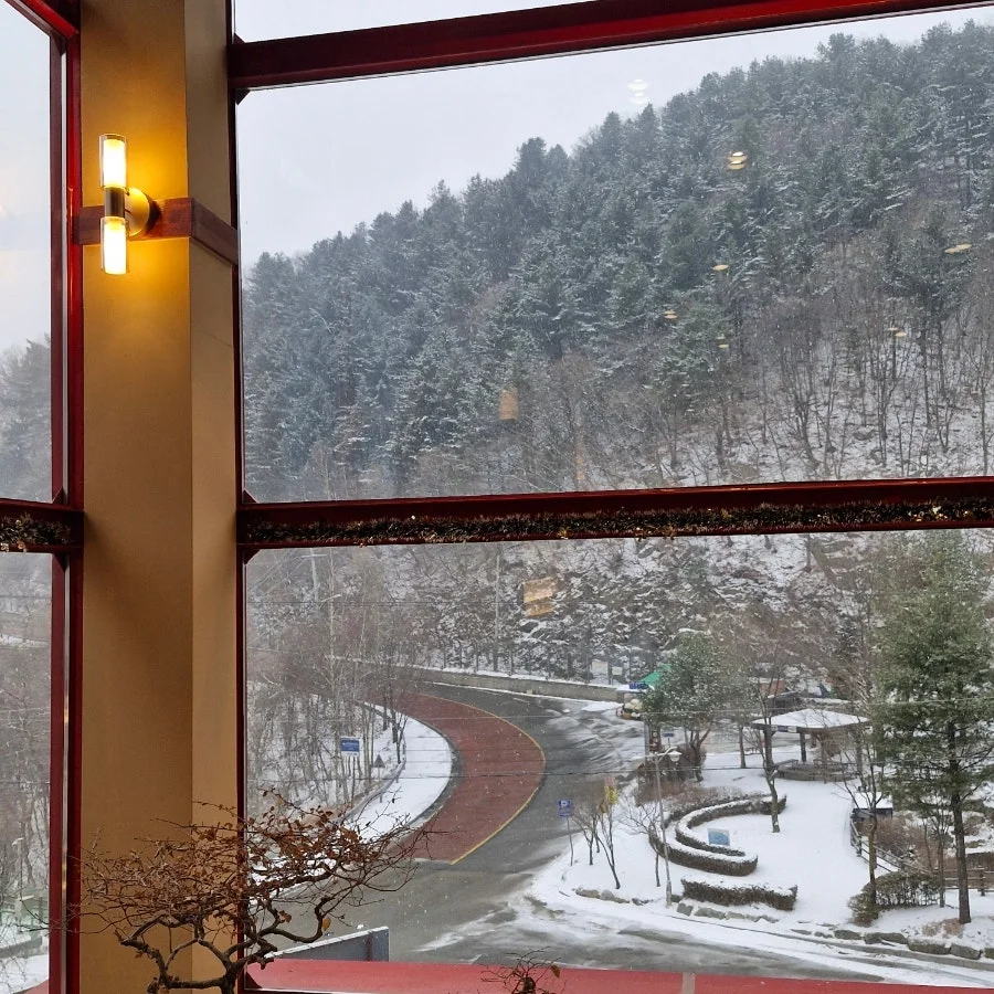 삼십 분을 운전해 도착한 산 중턱에 위치한 카페는 눈 덕분인지 다행히 주차장에서부터 카페 내부도 텅 비어 있었고, 카페의 통창 너머엔 온통 하얀 풍경만 가득했다. 내가 이곳에 찾을 때마다 앉던 자리에 앉자 아기는 놀라울 만큼 조용했다.