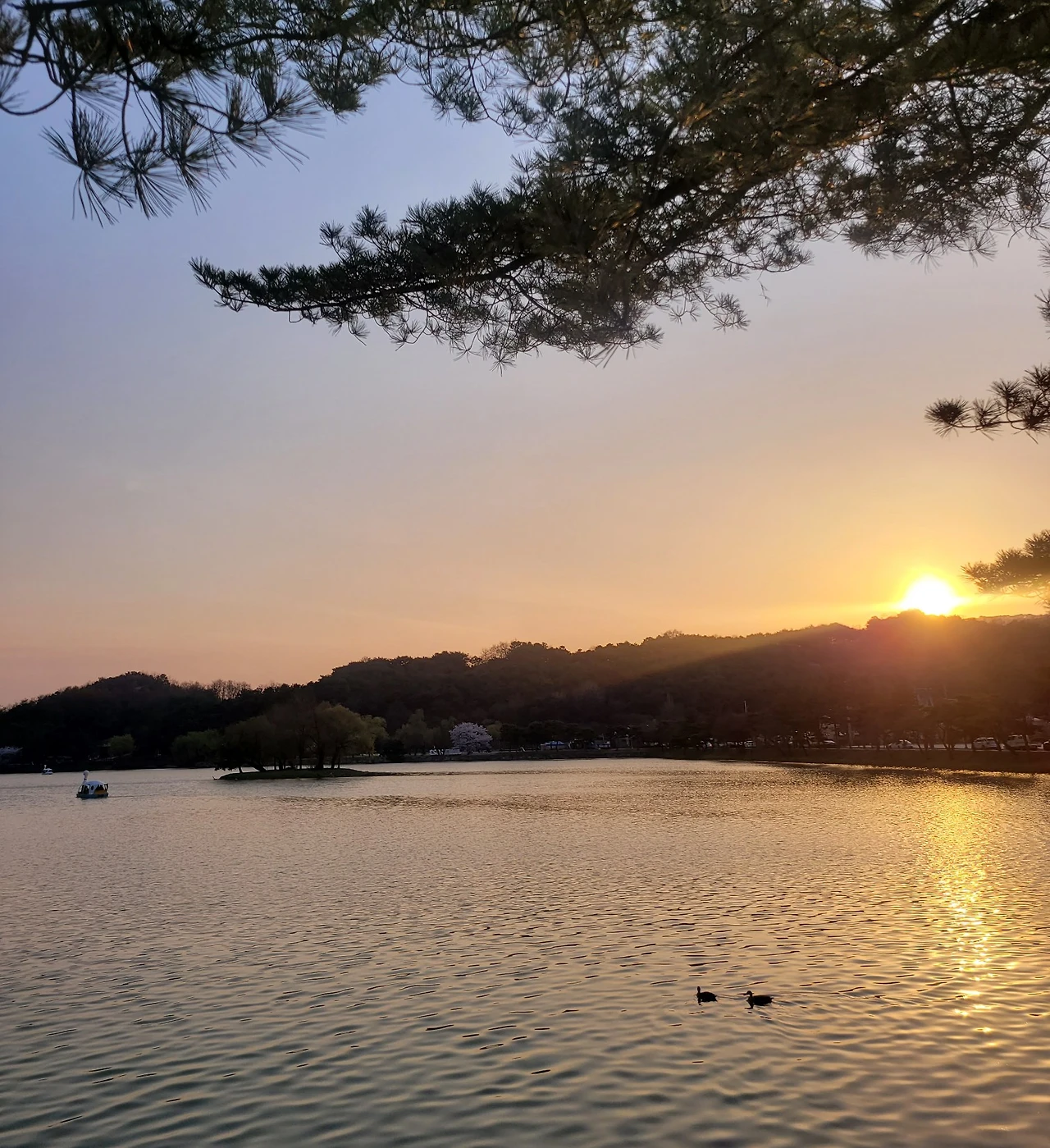해질녘의 의림지, 한 쌍의 오리와 저 멀리 오리배 하나