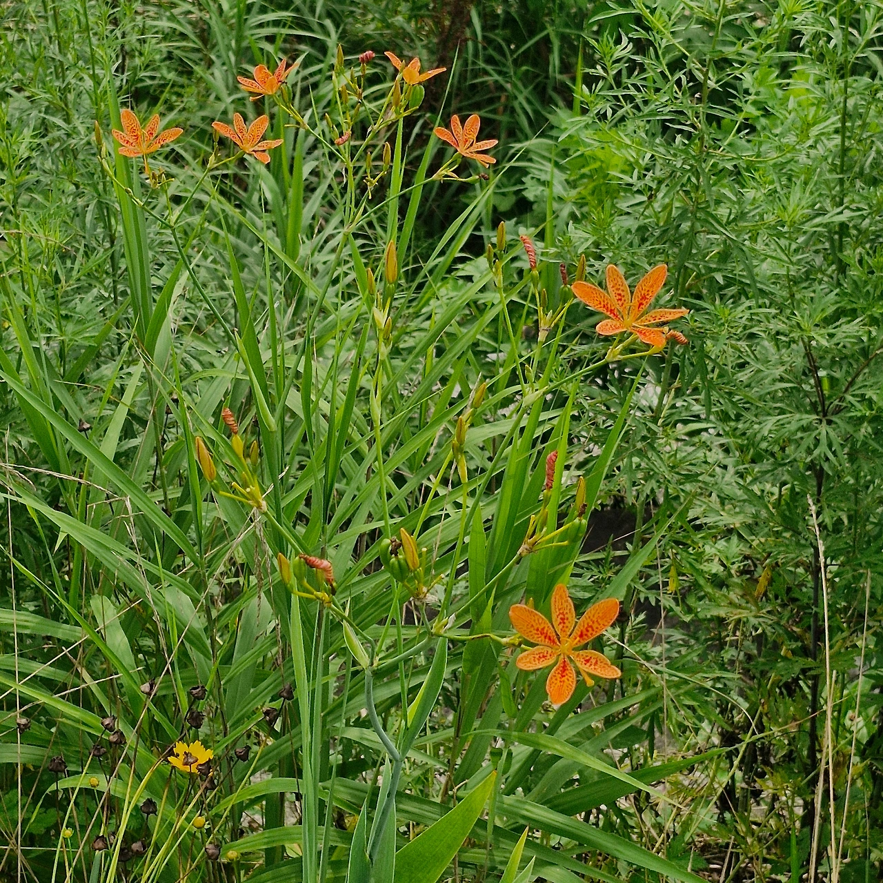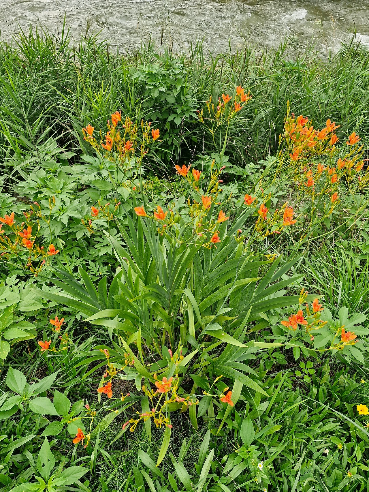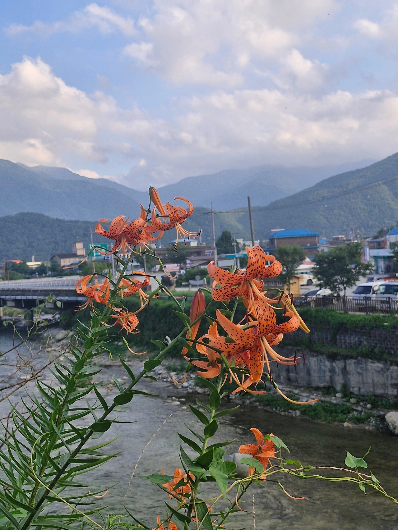 물가에 피어난 주황빛 꽃들이 곳곳에 활짝 피어있다.