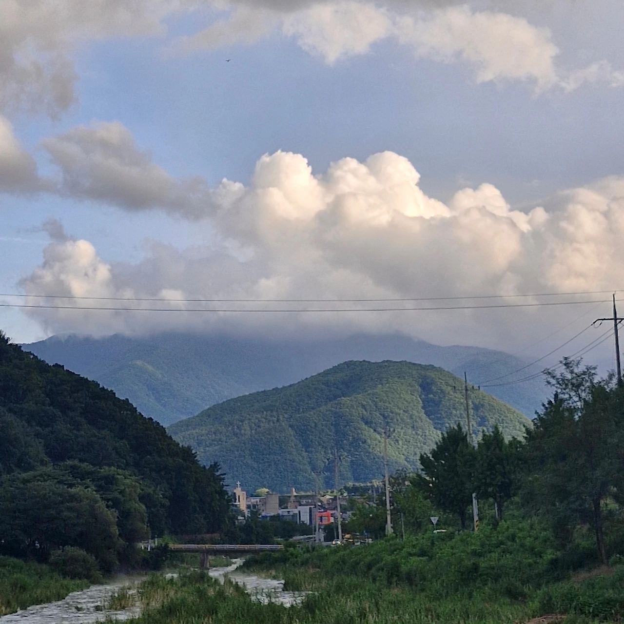 저 멀리 산에 구름이 걸려있었다.