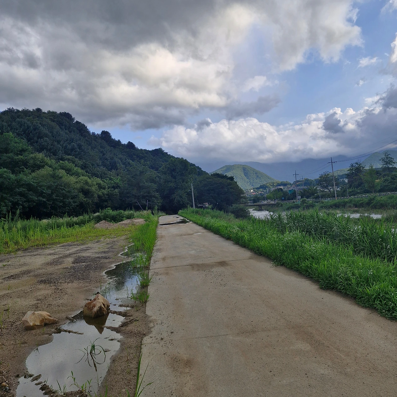 지난번 산책에 강 옆 웅덩이에 셀 수 없이 많은 올챙이들을 봤던 길,