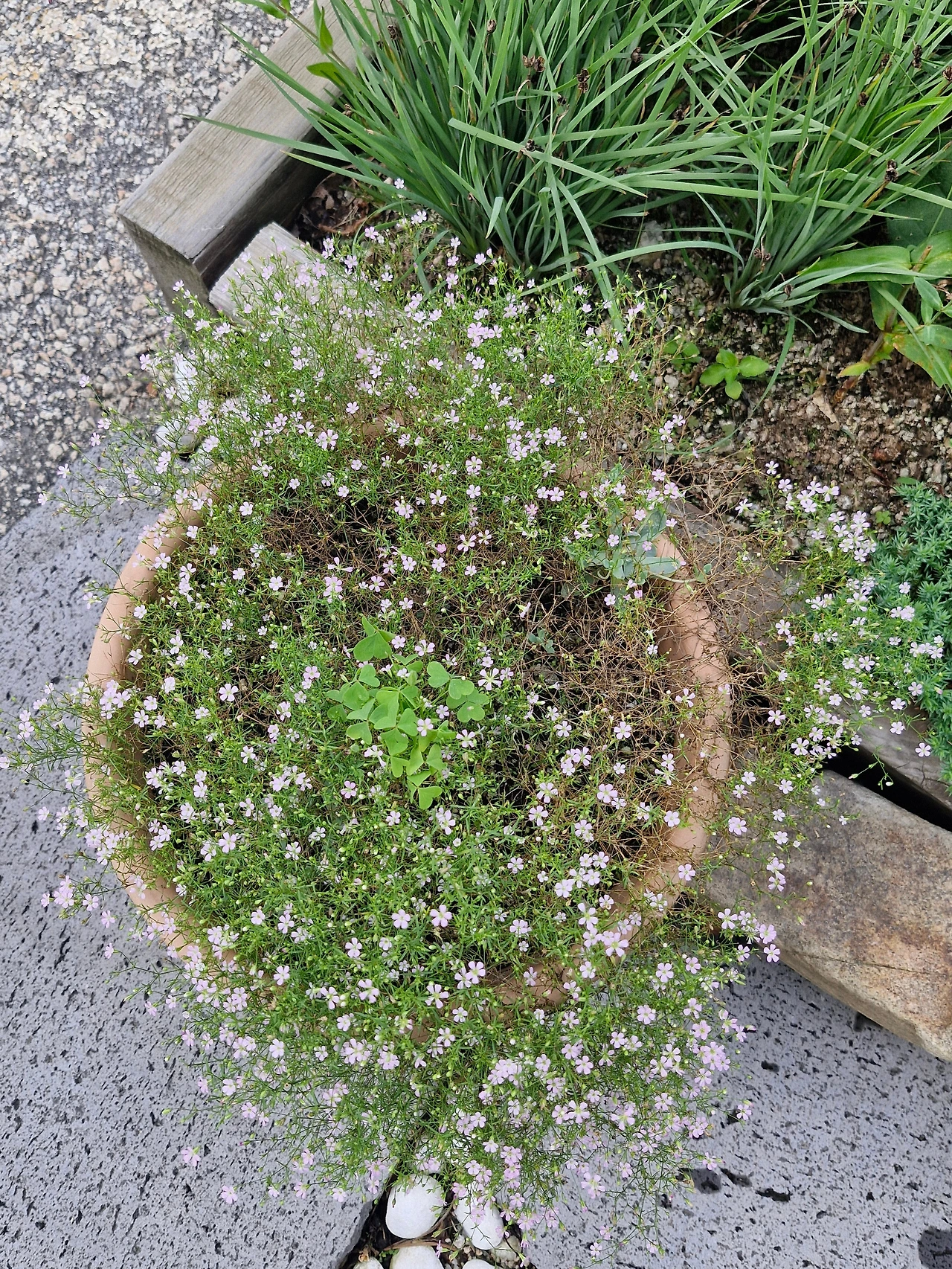 길가의 화분에 아무렇게나 피어난 잔 꽃들.