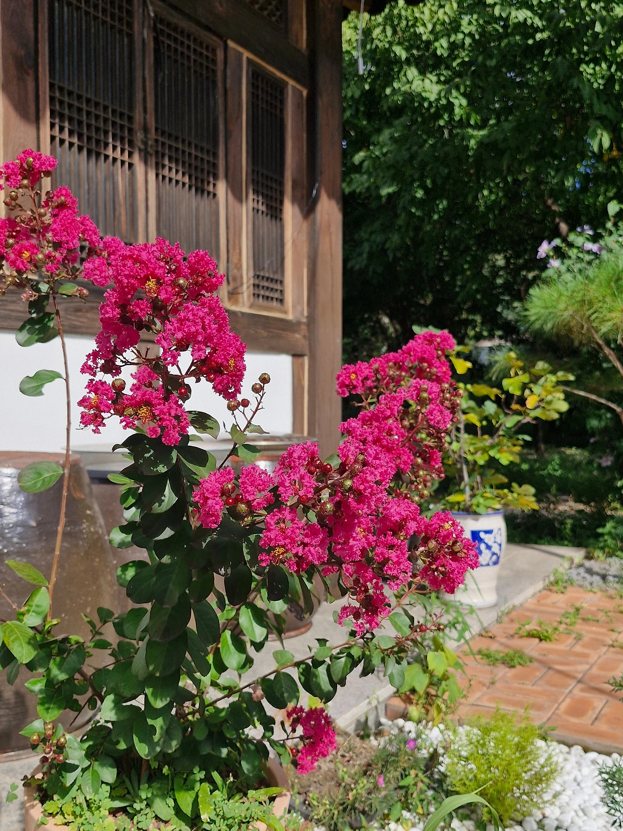 다양한 꽃들을 품은 고즈넉한 기와 물결,