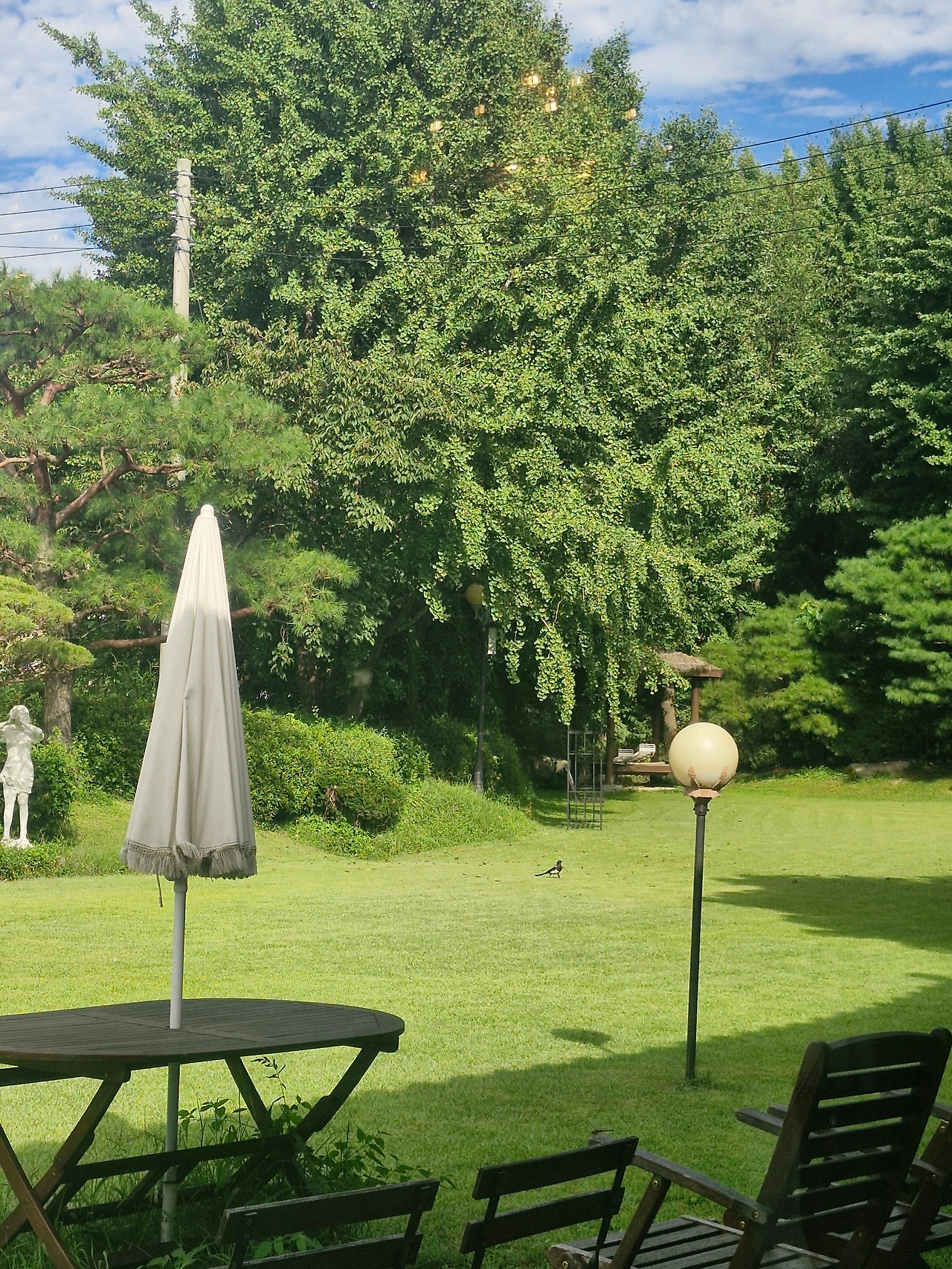 까치 한 마리가 종종거리며 정원의 잔디 위를 걷고 있다.