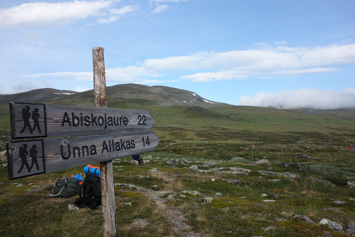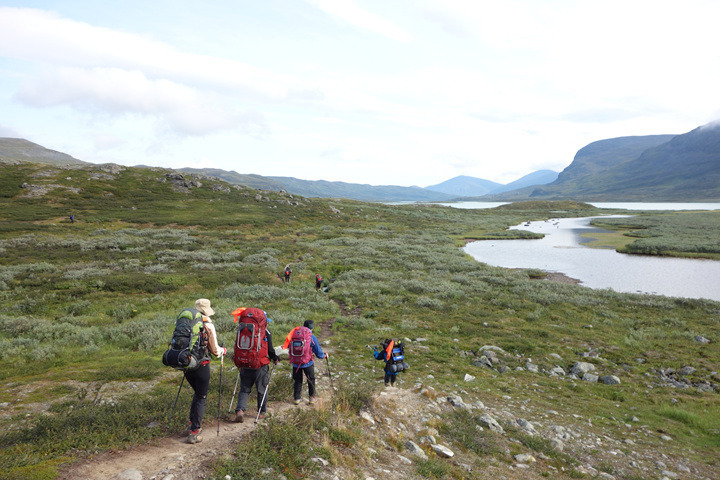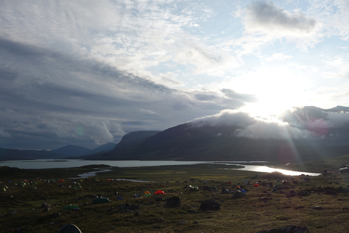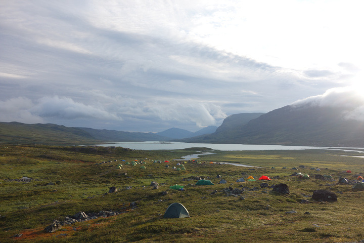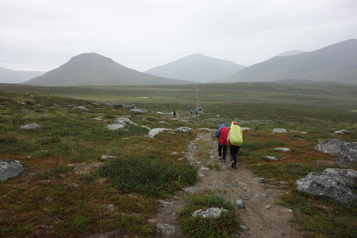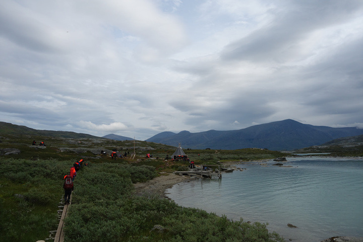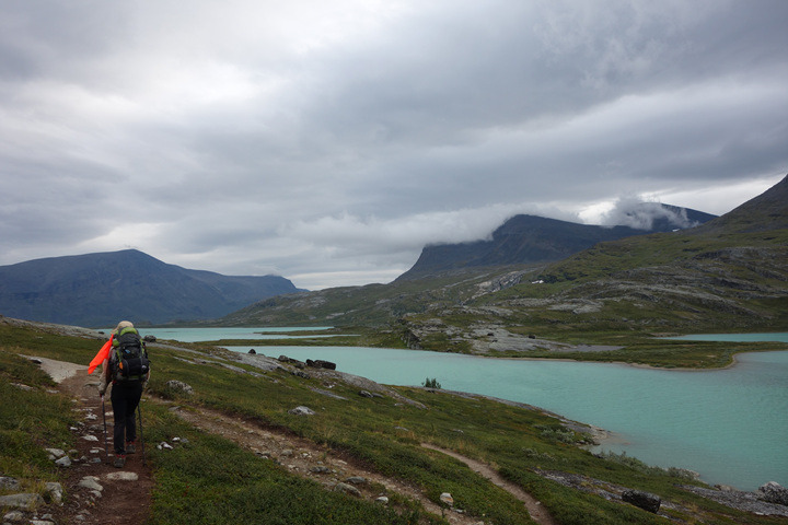 즉석 육개장으로 아침을 해결하고 주변을 정리한 후 오늘의 걷기 여행을 시작한다. 오늘은 길게 이어지는 여러 개의 호수를 계속 조망하며 걷는 호수의 길이다. 알레스(Alesjaure), 라토(Ratojaure), 미에사(Miesajaure), 아파르(Apparjaure) 호수가 한 군을 이루며 연속적으로 이어진다. 호수의 빛깔이 지금까지 보아오던 호수들과는 판이하다. 파스텔 톤의 에메랄드 빛이 무척 아름답다. 초원의 푸른 녹색에 파란 하늘색이 엷게 물들었다고나 할까. 호수와 호수 사이 좁아지는 목에서는 마치 명량, 울돌목을 연상시키는 거친 물소리가 났다.