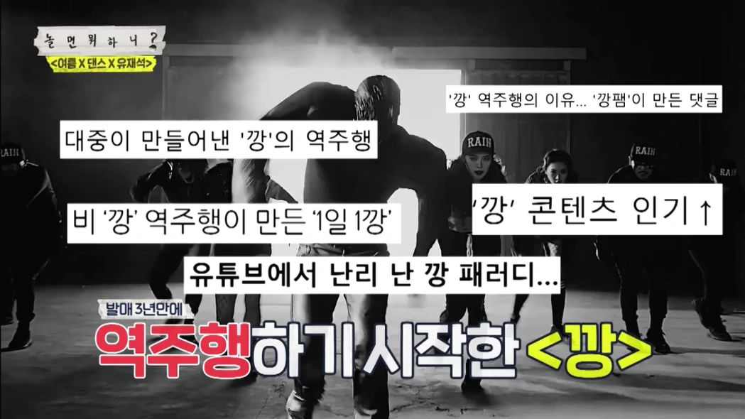 지난 5월 16일에 방영된 <놀면 뭐하니?> 42회에서는 여름맞이 혼성 댄스그룹 결성을 위해 멤버를 영입하는 과정에서 가수 비가 출연하였다. 최근 인터넷에서 인기를 끌고 있는 ‘깡’의 주인공인 비가 TV 예능 프로그램에 출연한 것이다. 그 후 <놀면 뭐하니?>는 5월 2주 차 비드라마 화제성 순위에서 전주 대비 화제성이 97.53% 상승하며 자체 최고 화제성 경신에 성공하였고, 비는 비드라마 출연자 화제성 3위를 기록하였다. <놀면 뭐하니?>는 어떻게 시청자의 마음을 사로잡고 이렇게 큰 반응을 이끌었던 것일까? 지금부터 42회 [여름 X 댄스 X 혼성그룹] 편을 낱낱이 파헤쳐 보면서 <놀면 뭐하니?>가 밈(meme) 문화에 대응하는 방식을 알아보겠다.