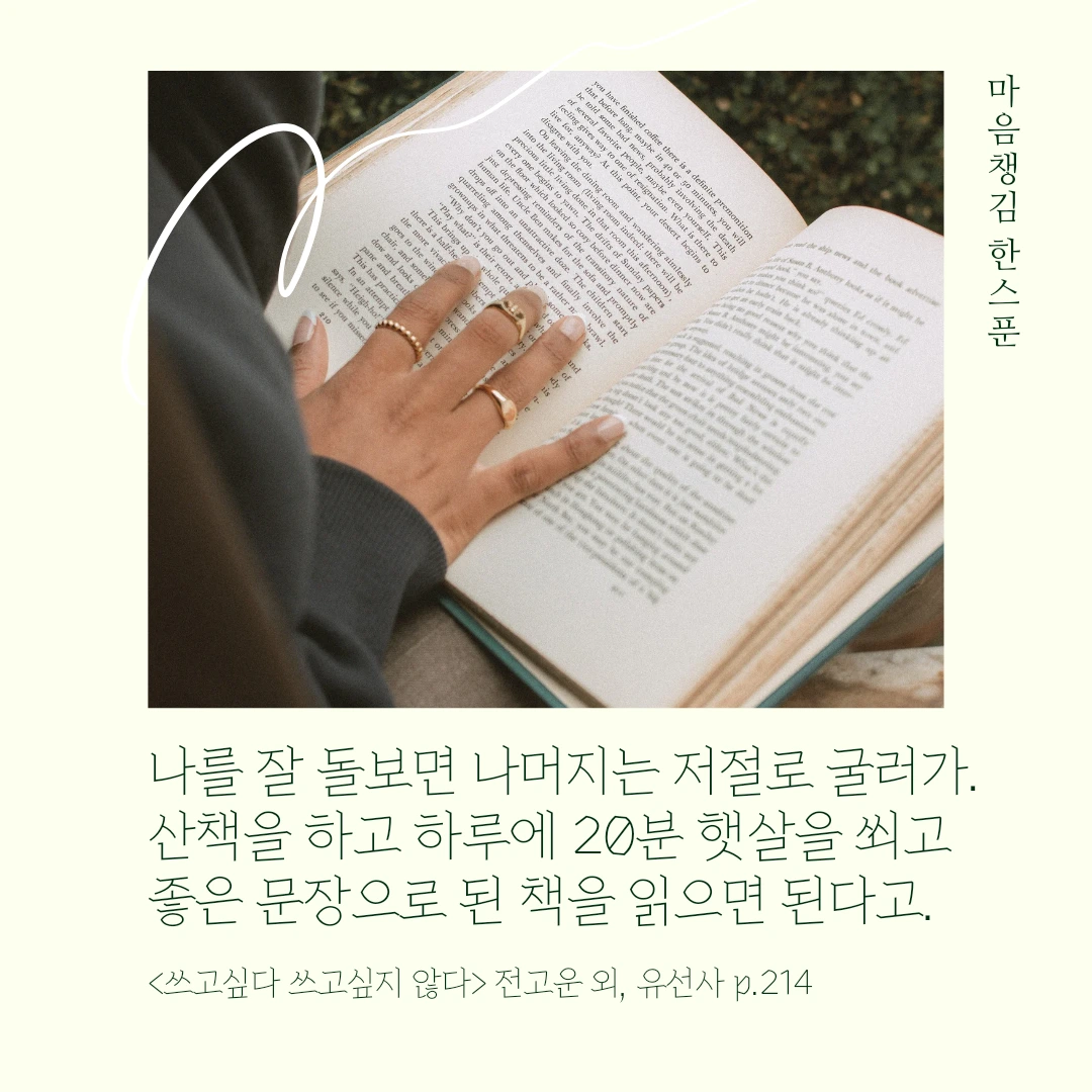 <마음챙김 한스푼>은 매일 읽고 쓰는 삶 속에서 길어 올린 좋은 구절을 나누기 위해 'canva'로 제작한 것입니다. 정기 구독을 하고 싶다는 분들의 따뜻한 마음을 담아 브런치에 연재를 시작해봅니다. 이 작은 울림과 위안이 하루를 보내는 데 든든한 버팀목이 되길 바랍니다 :)