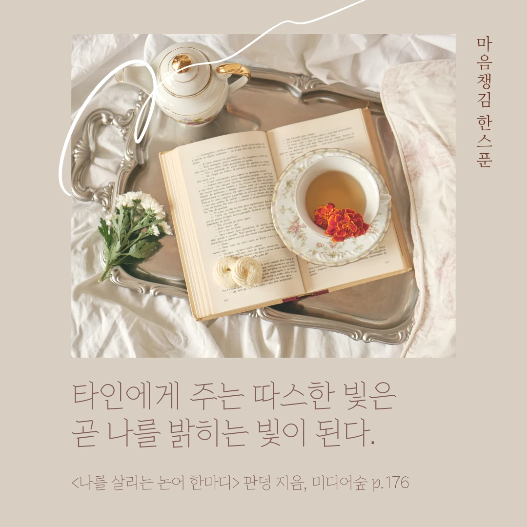 <마음챙김 한스푼>은 매일 읽고 쓰는 삶 속에서 길어 올린 좋은 구절을 나누기 위해 'canva'로 제작한 것입니다. 정기 구독을 하고 싶다는 분들의 따뜻한 마음을 담아 브런치에 연재를 시작해봅니다. 이 작은 울림과 위안이 하루를 보내는 데 든든한 버팀목이 되길 바랍니다 :)