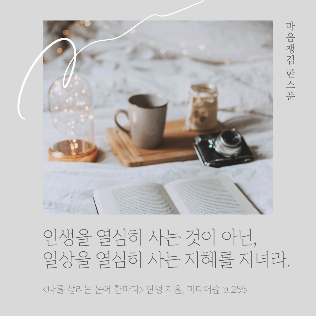 <마음챙김 한스푼>은 매일 읽고 쓰는 삶 속에서 길어 올린 좋은 구절을 나누기 위해 'canva'로 제작한 것입니다. 정기 구독을 하고 싶다는 분들의 따뜻한 마음을 담아 브런치에 연재를 시작해봅니다. 이 작은 울림과 위안이 하루를 보내는 데 든든한 버팀목이 되길 바랍니다 :)