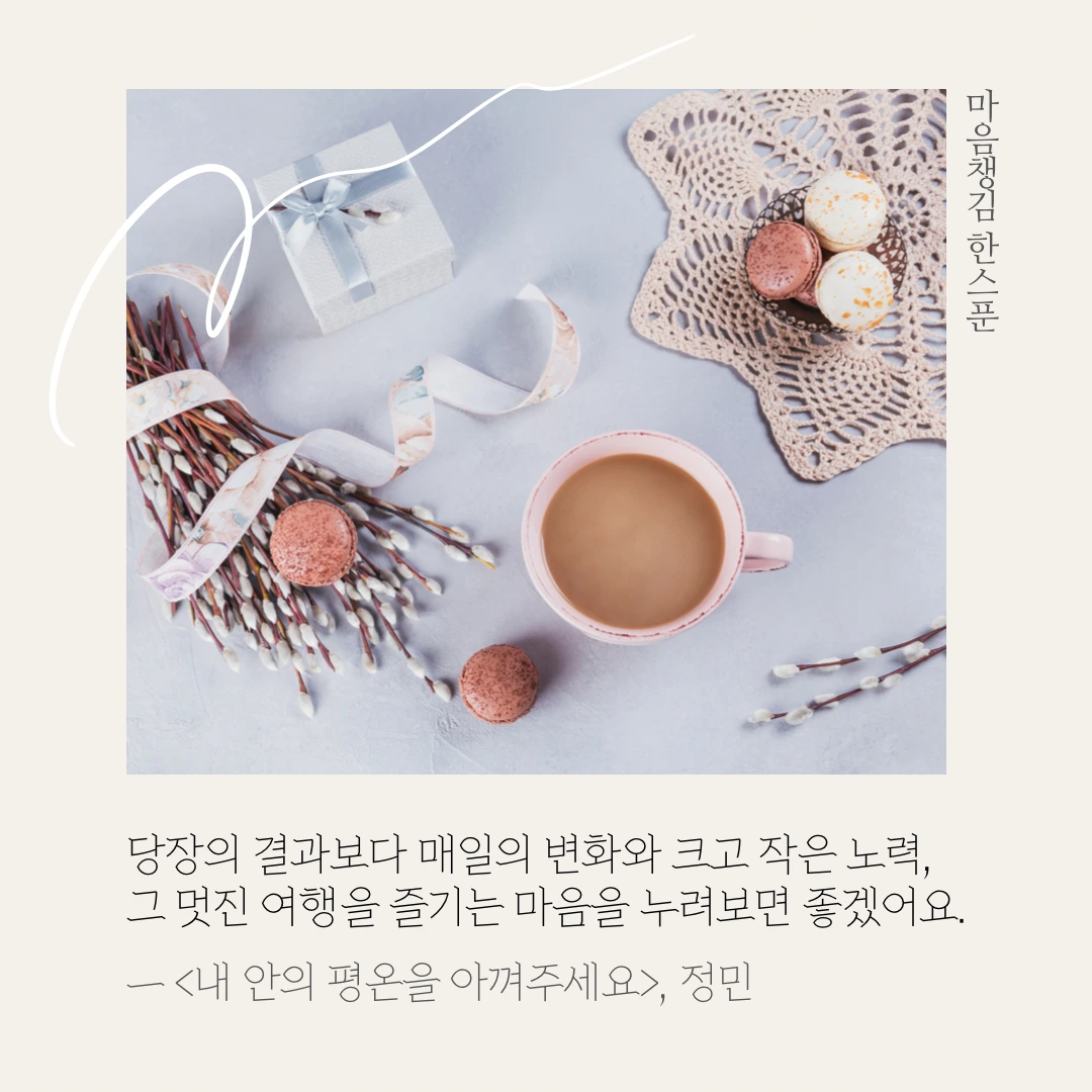 마지막에 마지막엔 '나'를 평가하고 있는 나를 발견하게 됩니다. 누군가와 나를 비교하는 마음도 힘들지만, 원하는 나의 모습과 현재의 나를 비교하는 마음은 더욱 참담합니다.