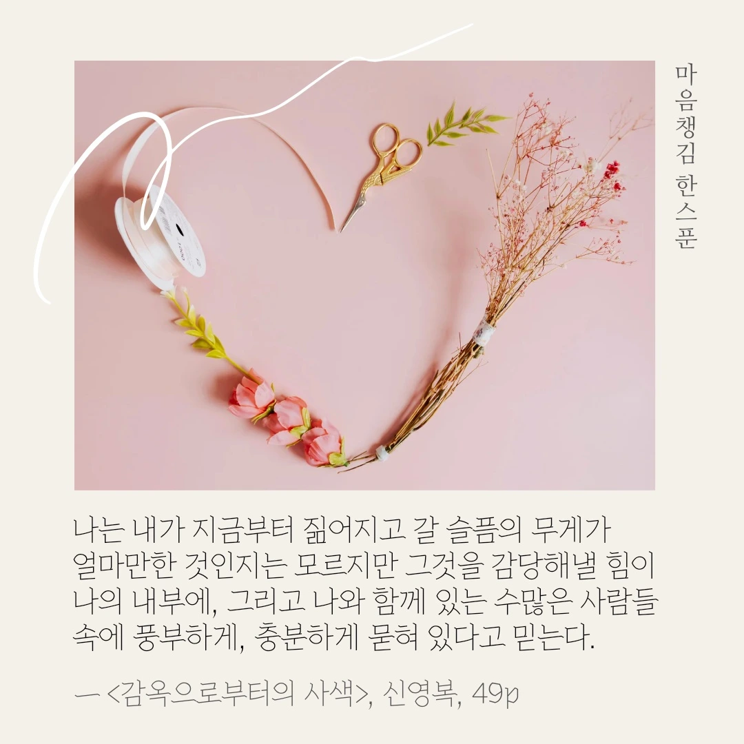 다시 오늘, 새벽 4시 20분에 눈이 번쩍 뜨였습니다. 새벽 독서실 문을 열고 모닝페이지를 썼습니다. 책을 읽고 이렇게 글을 쓰고 있자니 몸마음이 한결 가볍네요. 학기초만큼 정신없는 학기말이 다가왔건만 집안일로 혼이 나간 기분. 할 수 없는 일은 내려 놓고 할 수 있는 일에 집중해야지. 선택과 집중.