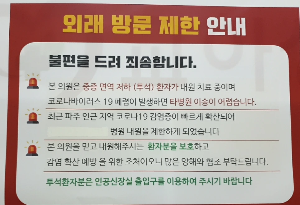 "정연님, 저예요. 일산에 사는 저희 직원이 교회 지인과 접촉해서 검사를 받았는데 확진 판정을 받았어요. 그래서 저를 비롯한 모든 직원들이 검사를 받았고 음성 판정을 받았습니다. 그래서 병원 운영은 그대로 하는데, 보건소에서 조건을 걸었어요. 환자들이 한 번에 몰리지 않게 시간을 나누고, 환자 간 병상 간 거리를 두고 투석 한 타임이 끝나면 30분씩 소독을 하는 것으로요. 내일 정연님은 10시 정도에 오시면 될 것 같은데 괜찮으실까요?
