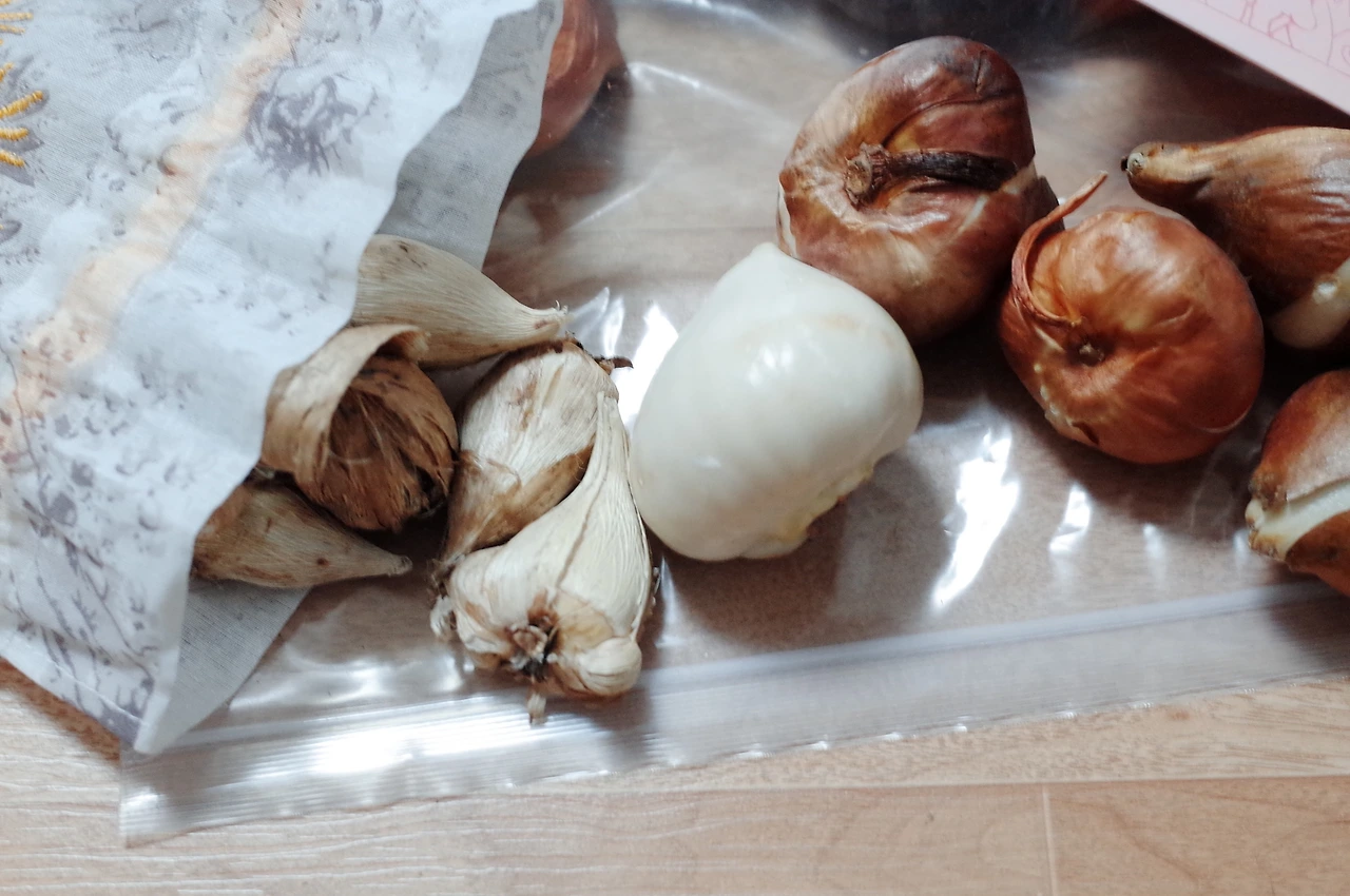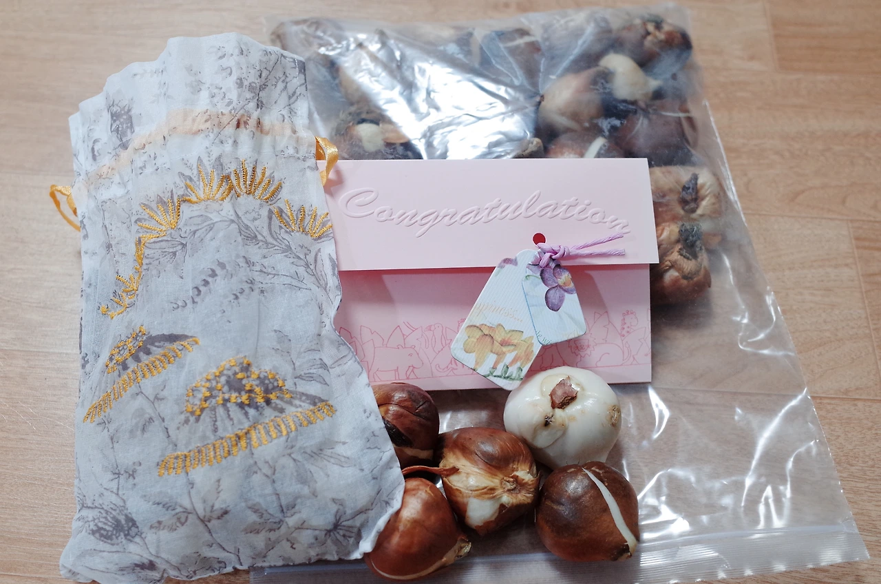 부직포 봉투에는 프리지어 구근이 들었고, 커다란 마늘 같은 것이 튤립 구근.