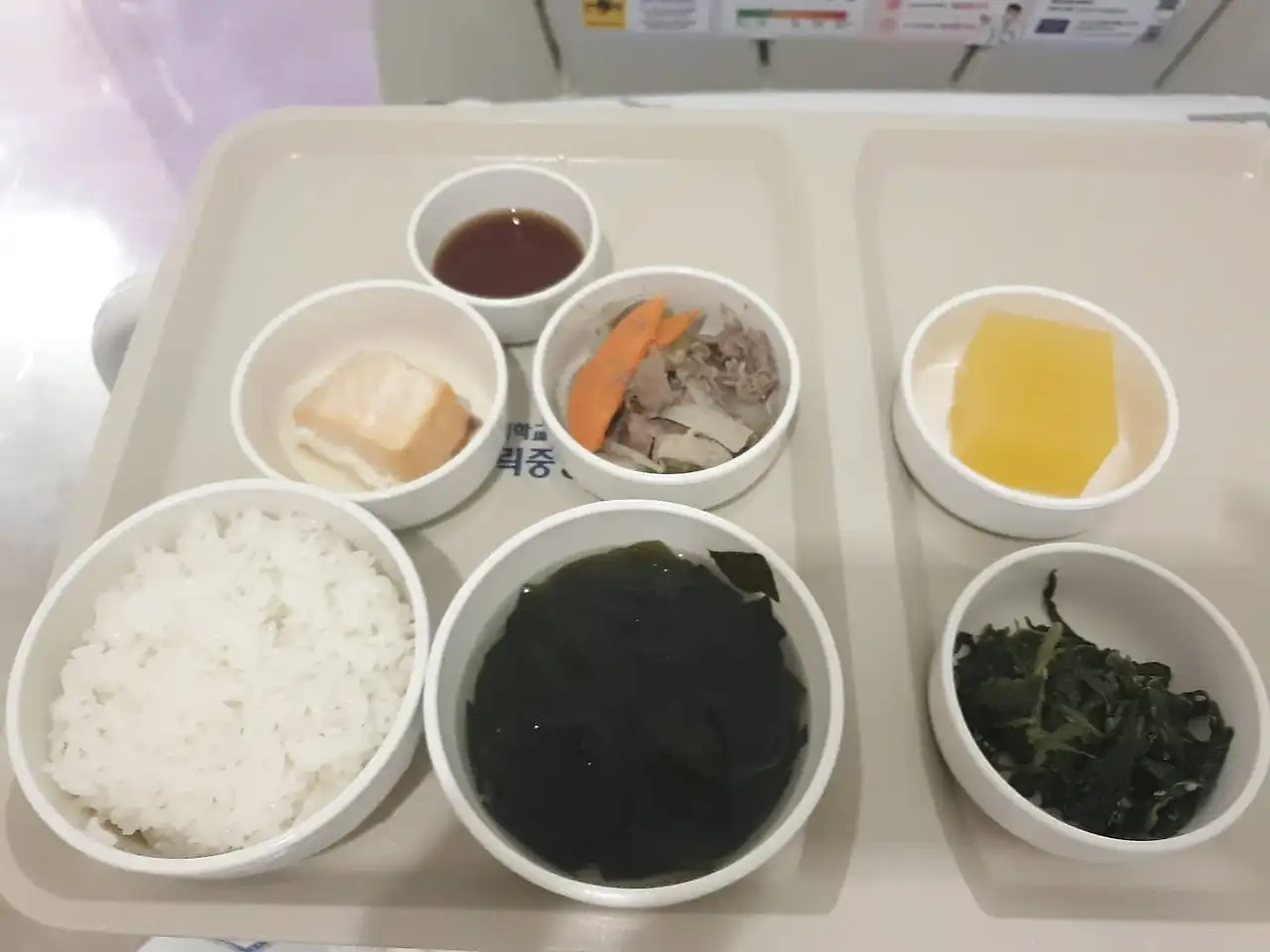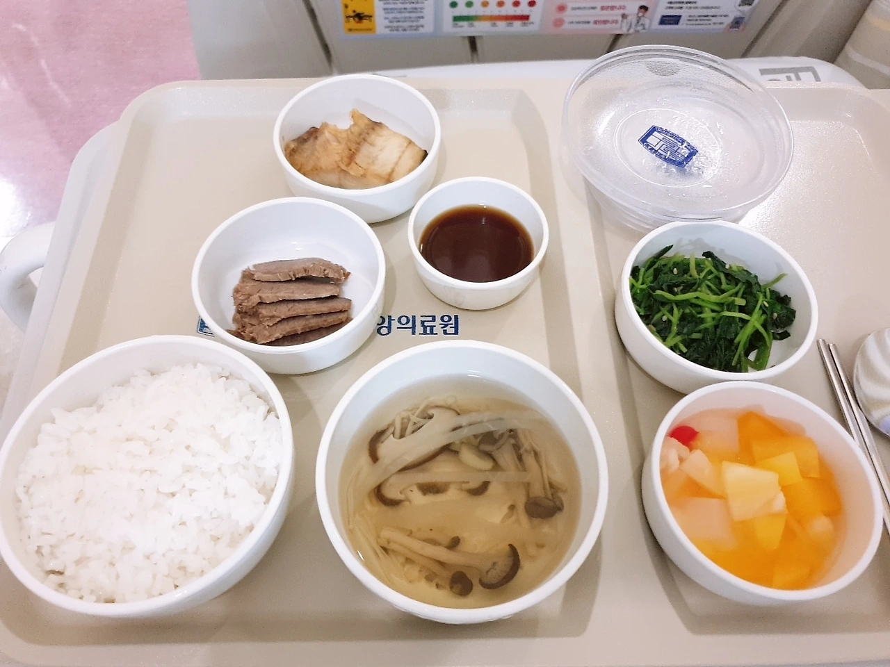 저는 생선이나 나물 이름을 도통 모르겠습니다. 하여간 쌀밥에 심심한 버섯 뭇국, 유채나물(?), 생선구이와 소고기 사태 수육, 후르츠 칵테일이 담긴 한 상입니다. 너무 퍽퍽해서 간장을 살짝 찍어서 눈물을 삼키며 밥 한 공기를 다 비웠습니다. 오늘 저녁부터 또 금식이거든요.