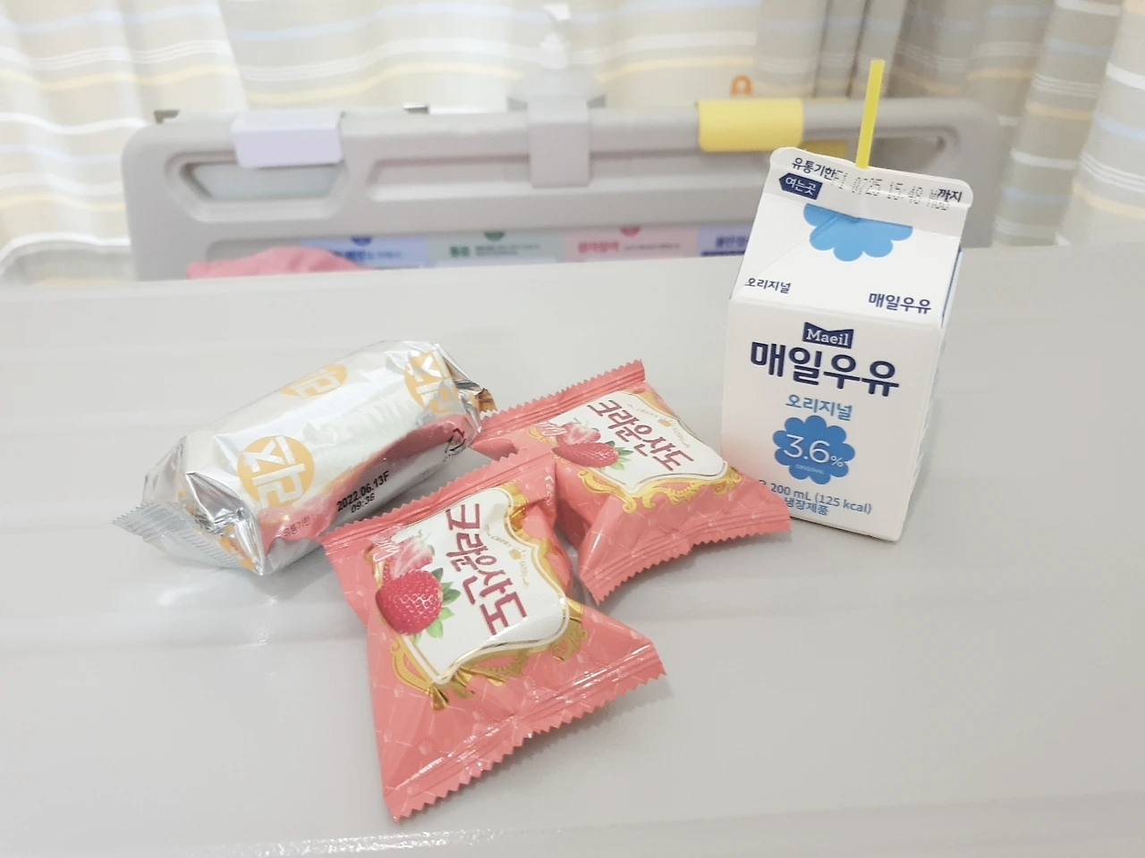 크크크. 식사 때 나왔던 우유를 마시지 않고 냉장고에 두었었다. 그 우유에 빨대를 꽂고, 딸기 산도 두 봉지와 리츠 크래커 한 봉지를 펼쳐두고 먹기 시작한다. 세상에, 꿀맛! 위장이 차오르니 살 것 같다. 산도를 먹고 있는데 "이정연 님~" 하더니 간호사 선생님이 나타났다. 커튼을 열고는 내가 과자 먹는 모습에 놀란다. 내가 아까 배고프다고 어필을 했었거든. 근데 아무것도 없으니 물 마시며 버티라고 선생님이 말씀하셨다. 그런데 내가 과자를 먹고 있으니 얼마나 놀랐겠어?