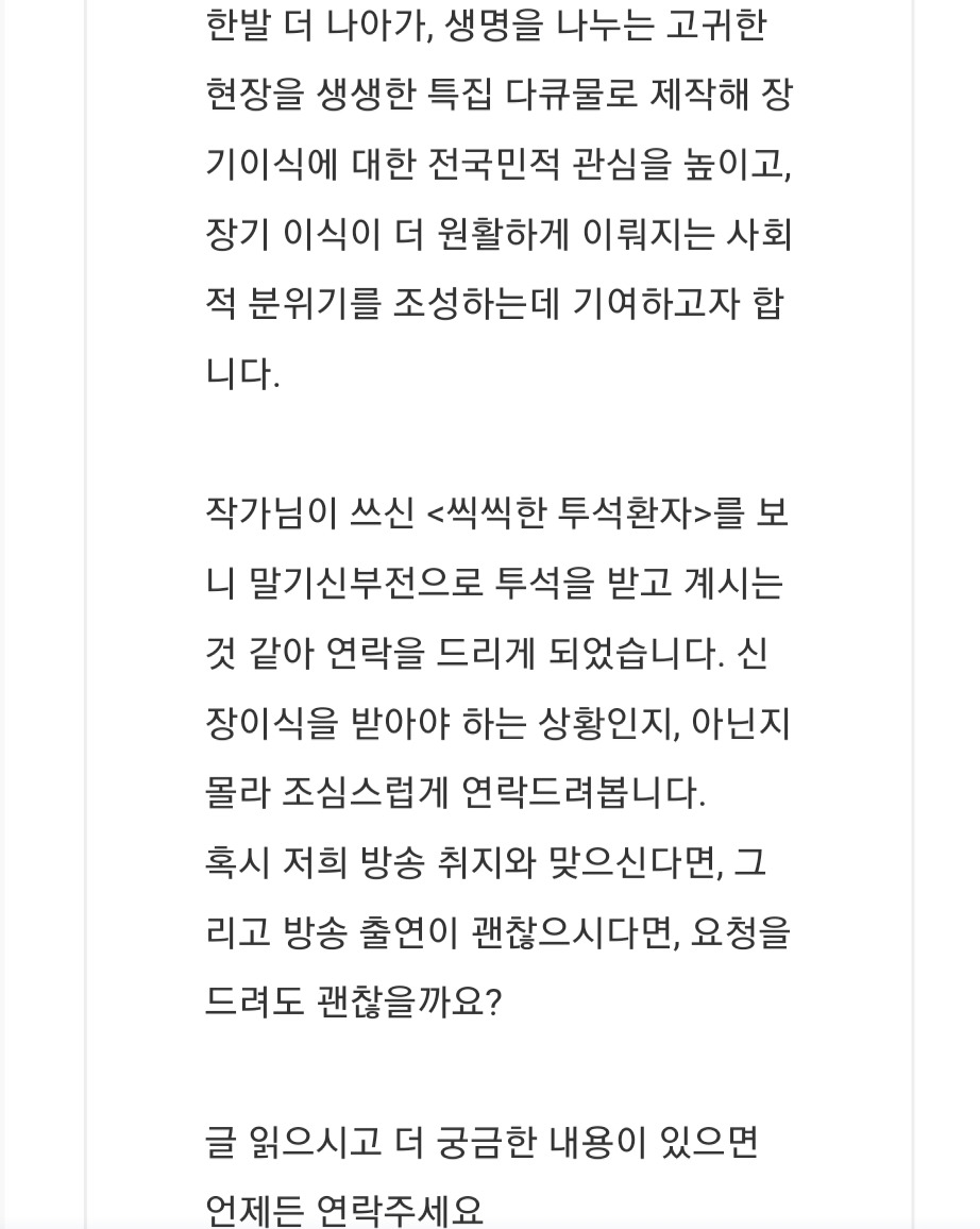 '아프지만 씩씩하게 이식을 기다리는 투석환자'? 아니면 '젊은데 이식을 받지 못해 애처롭게 살아가고 있는 투석환자'? 그 어떤 역할도 하고 싶지 않았습니다. 제가 이식을 기다리는 투석환자의 대표 격이 되어 인터뷰와 촬영을 해서 투석환자에 대한 잘못된 선입견을 드리고 싶지 않았습니다.