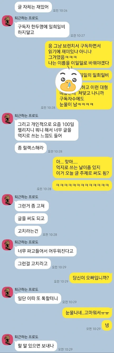 사무실에 들어와 보니 벌써 부장님은 출근해서 커피를 드시고 계셨다. 사무실에 혼자가 될 때마다, 또 간밤의 기분이 나를 뒤덮었다. 이대로는 안 되겠다 싶어서 제일 친한 두 사람에게 연락을 했다. 그들의 이야기에, 그 다정함에 눈물이 났다. 누가 들어올세라 얼른 눈물을 닦았다.