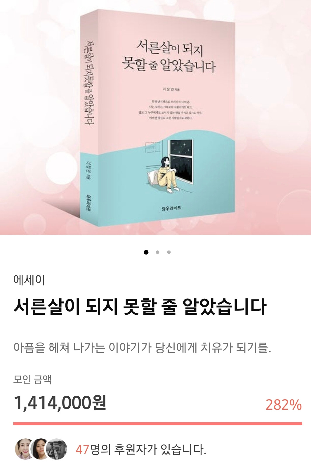 아직 제 책이 세상에 나오지는 않았지만, 이미 제 손은 떠났다고 보면 돼요. 지금 텀블벅이라는 클라우드 펀딩 사이트에서 순조롭게 예약 판매가 진행되고 있어요.