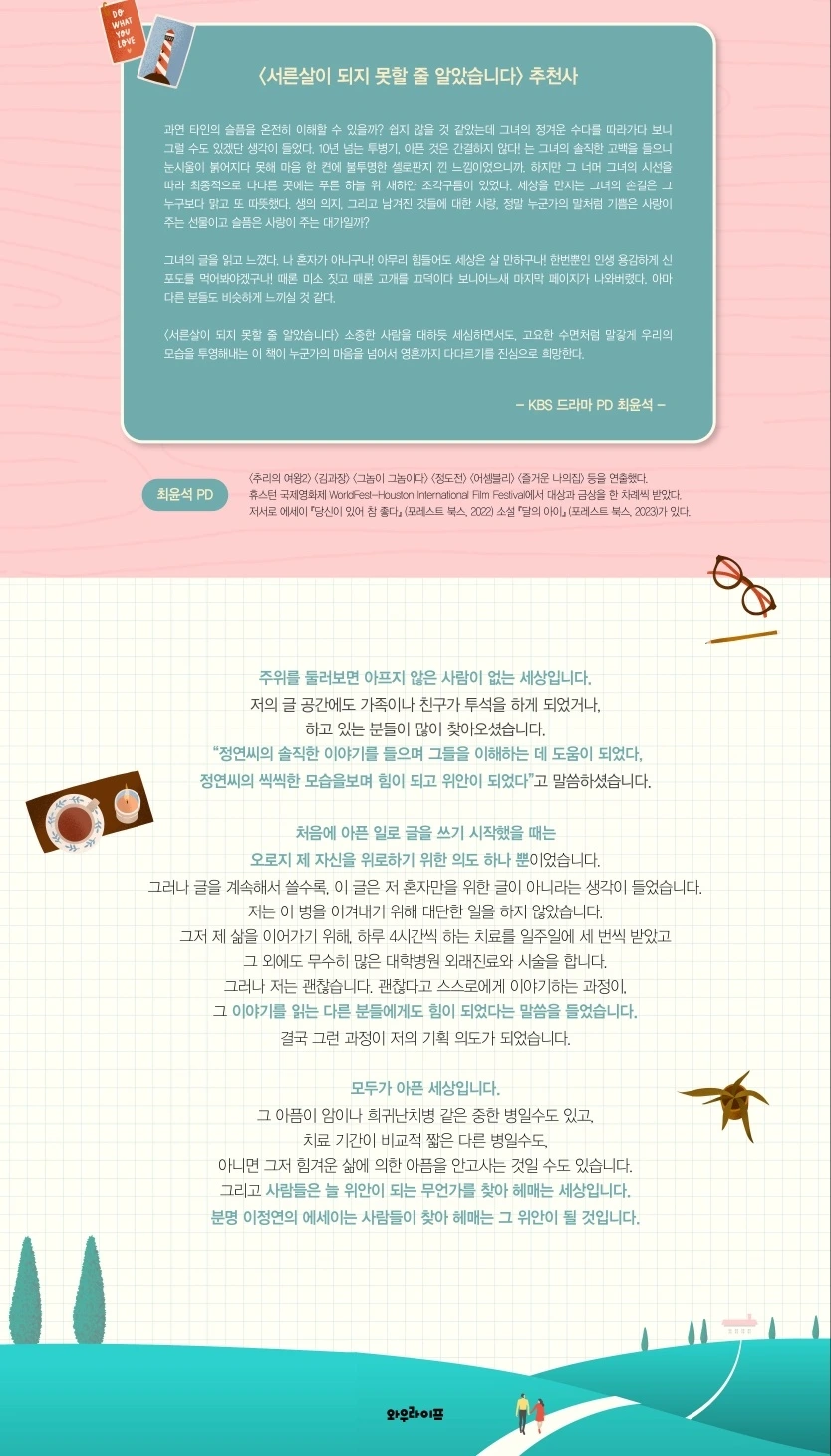 게다가 저의 이름도 (진짜) 얼굴도 모르시는데, 텀블벅 앱을 설치하시거나 텀블벅 홈페이지를 통해 정식 출간 전의 예약구매 후원을 해주고 계신 분들 덕분에 참으로 감사한 나날을 보내고 있습니다. 혹 텀블벅에서 구매하지 않으셨더라도, 앞으로 봄이 되면 서점에서도 편히 만나보실 수 있으니 너무 염려하지 마시고요. 또 구매하지 않으셔도 어떤가요? 제 글을 좋아해 주시고, 저를 격려해 주시는 진심들을 늘 느끼고 있는걸요.