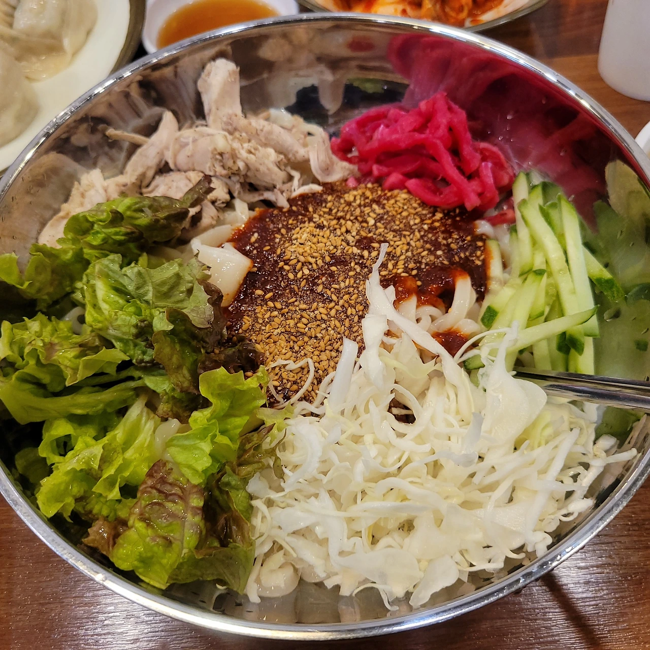 나의 바지락 칼국수가 나오고, 이내 정남이가 주문한 칼비빔면이 나왔는데 나오는 모습을 본 순간 홀렸다. 일단 비비기 전의 모습이 매우 푸짐하고 아름다웠다. 그리고 고소한 향기가 솔솔 났다. 칼비빔면 그릇이 나오자마자 '아차, 주문을 잘못했구나!' 생각했지만 절대 집적거리는 표는 내지 않았다. 정말이다.