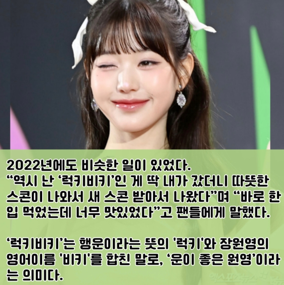 혹시 이 원영적 사고에 대해 모르는 분이 계실까 봐 아주 간단하게 설명을 하자면, 낙천주의에 가까운 긍정적 사고를 하는 한 여자 아이돌의 태도를 말하는 것이다. 예를 들어, 앞의 사람이 빵을 모두 사가는 바람에 (빵을 못 살 뻔했으나, 새 빵이 나와서) 따끈한 새 빵을 살 수 있었으니 럭키비키잖앙? 뭐 이런 사고의 흐름이라고 한다. 오히려 좋아, 20살 장원영의 멋진 긍정의 자세다.